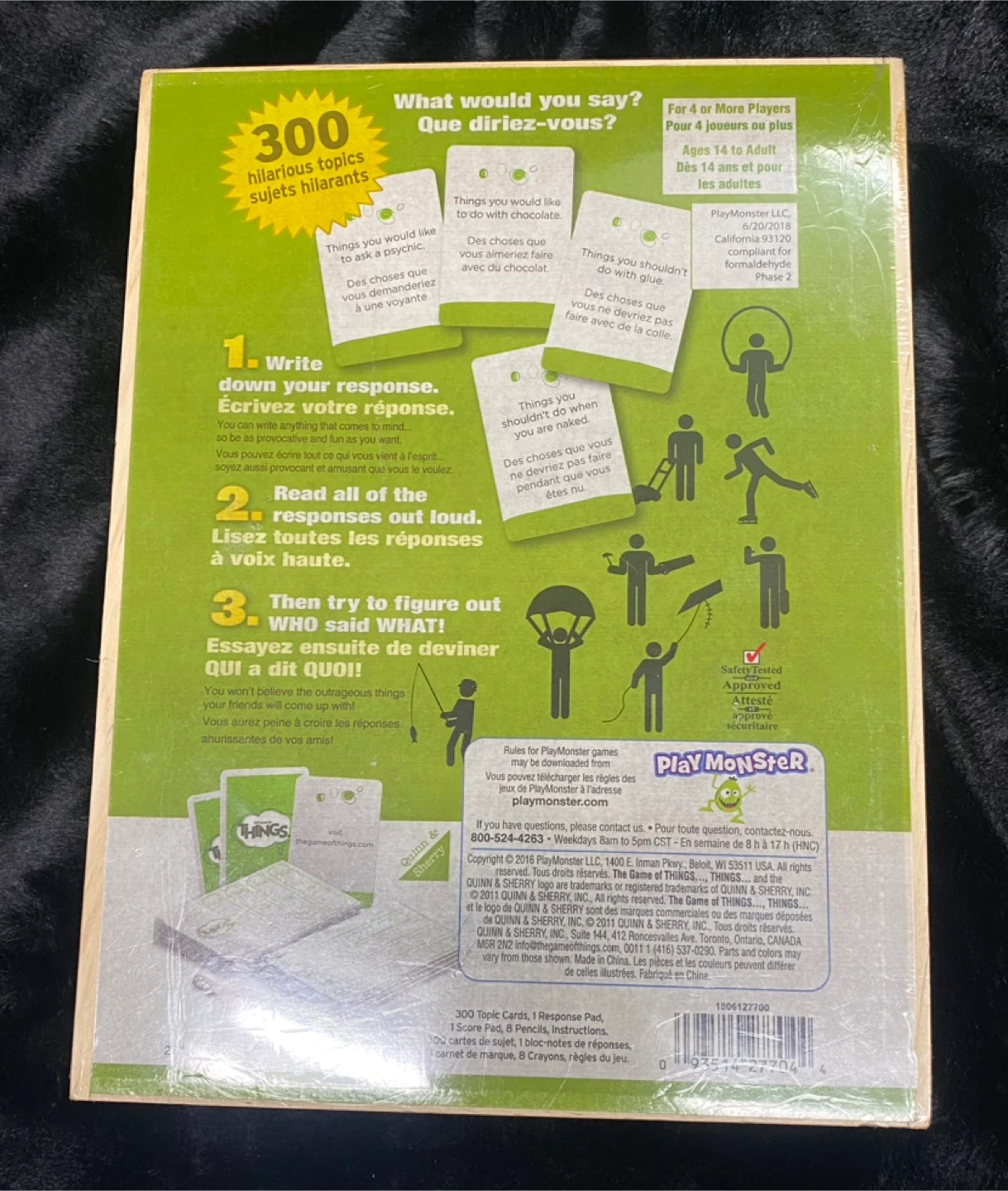 Pick a topic and write a response, then guess who said what. It's for 4 or more players and ages 14 to adult. This hilarious game includes 300 topics for endless fun!