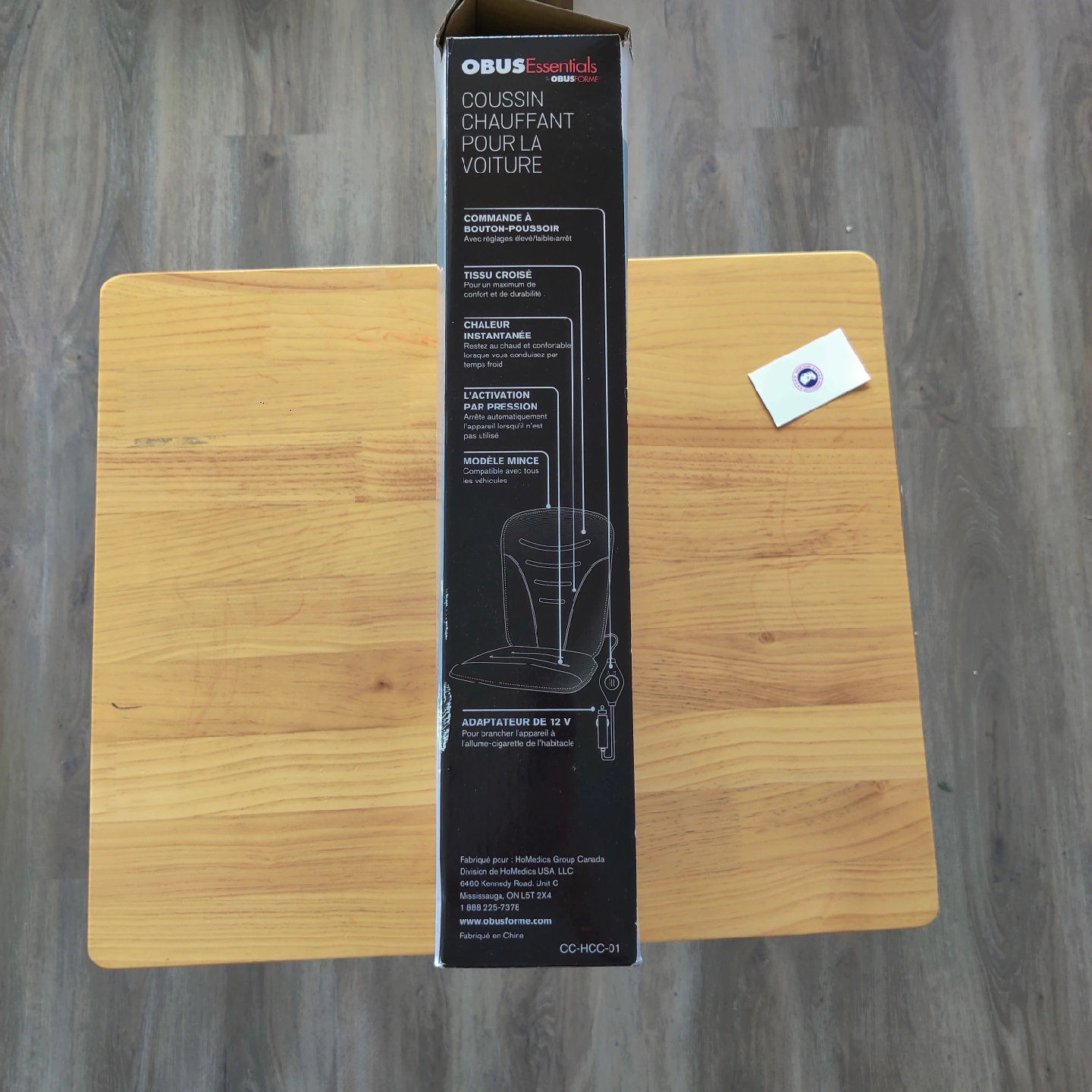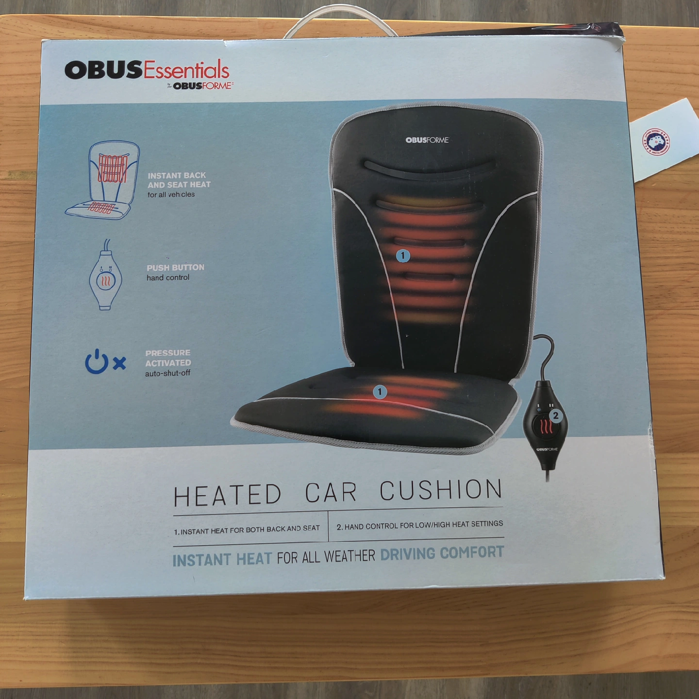 Brand new OBUS Essentials heated car cushion, still in the box! It features: - Push-button hand control with high/low/off settings - Woven fabric for warmth and durability - Instant heat for a warm and comfortable ride on cold days - Pressure activated auto-shutoff - Slim profile design - 12-volt adaptor plugs into your car lighter
