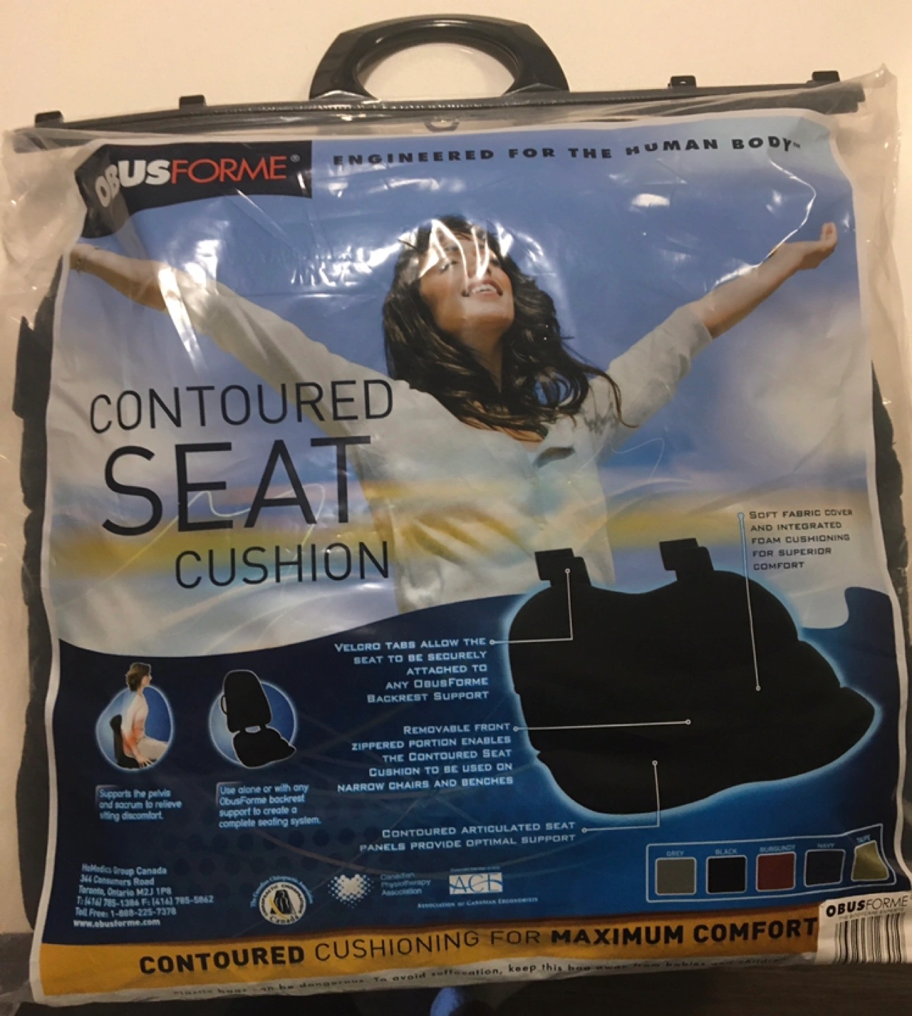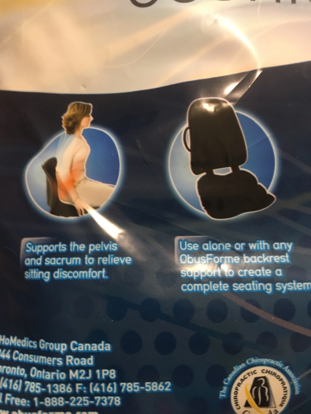 Selling a brand new ObusForme contoured seat cushion, still sealed in its original packaging! This cushion is designed to provide optimal support and relieve sitting discomfort. It features: - Soft fabric cover - Contoured articulated seat panels - Velcro tabs for secure attachment to any ObusForme backrest support - Removable front zippered portion for use on narrow chairs and benches Perfect for office chairs, car seats, or anywhere you need a little extra comfort and support