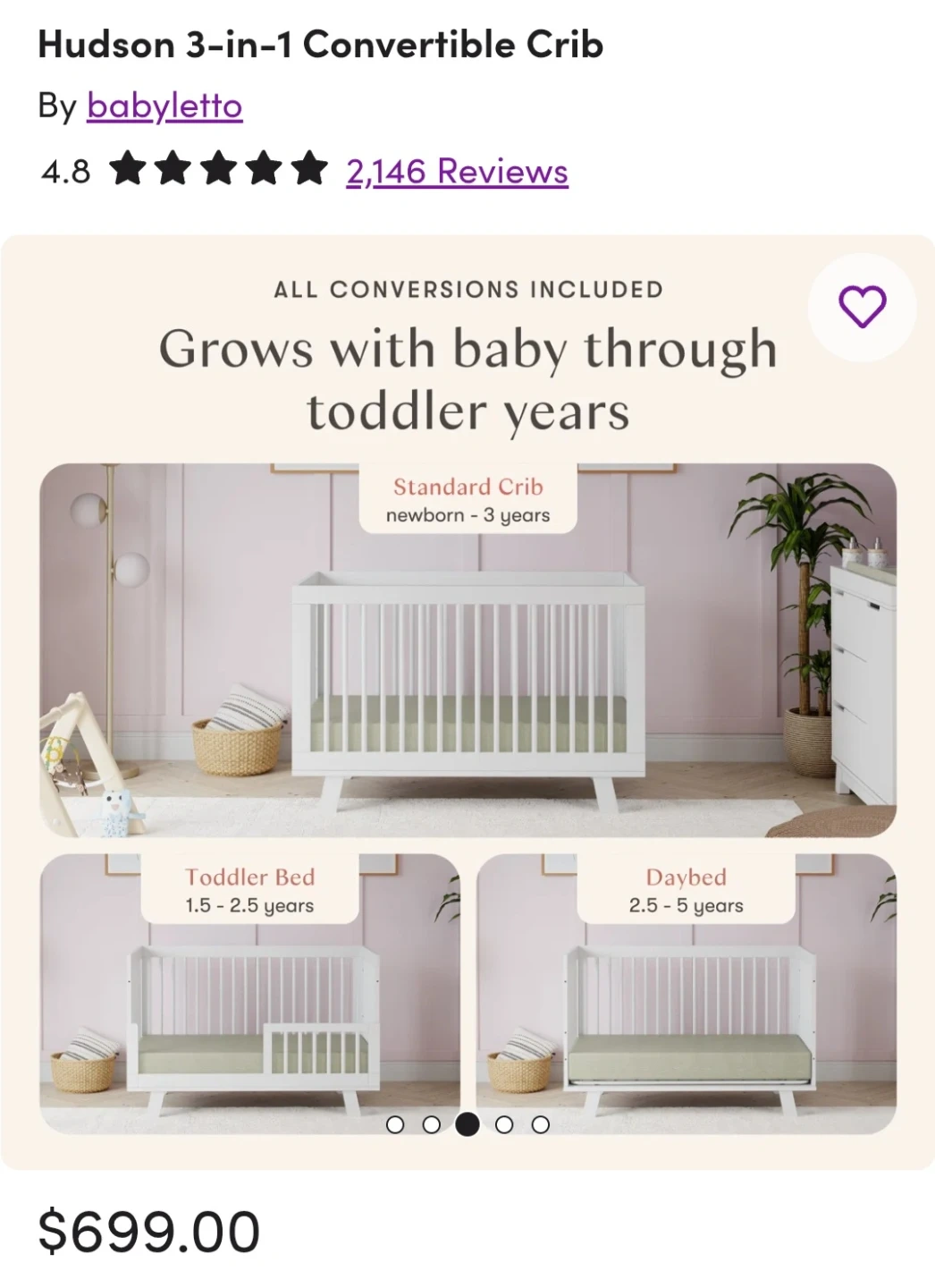 Babyletto Hudson 3-in-1 convertible crib + 5inch mattress