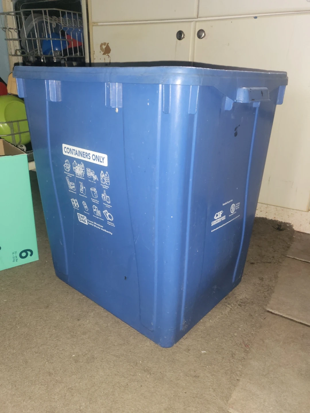 This blue bin is designated for containers only. It has clear labelling with icons indicating accepted items. Made from durable plastic, it's built for curbside collection. Useful for any household committed to recycling!