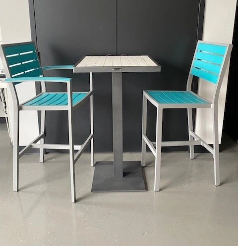 Selling an outdoor bar height table with two matching chairs! The set features a sleek design with a square table and comfortable bar stools. The chairs and table are made with a grey aluminum frame and teal slats, perfect for adding a pop of colour to your patio or deck