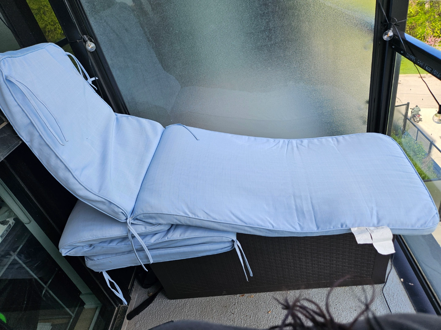 Outdoor chaise lounge cushion set. Light blue fabric. Two-piece design. Perfect for patio furniture.