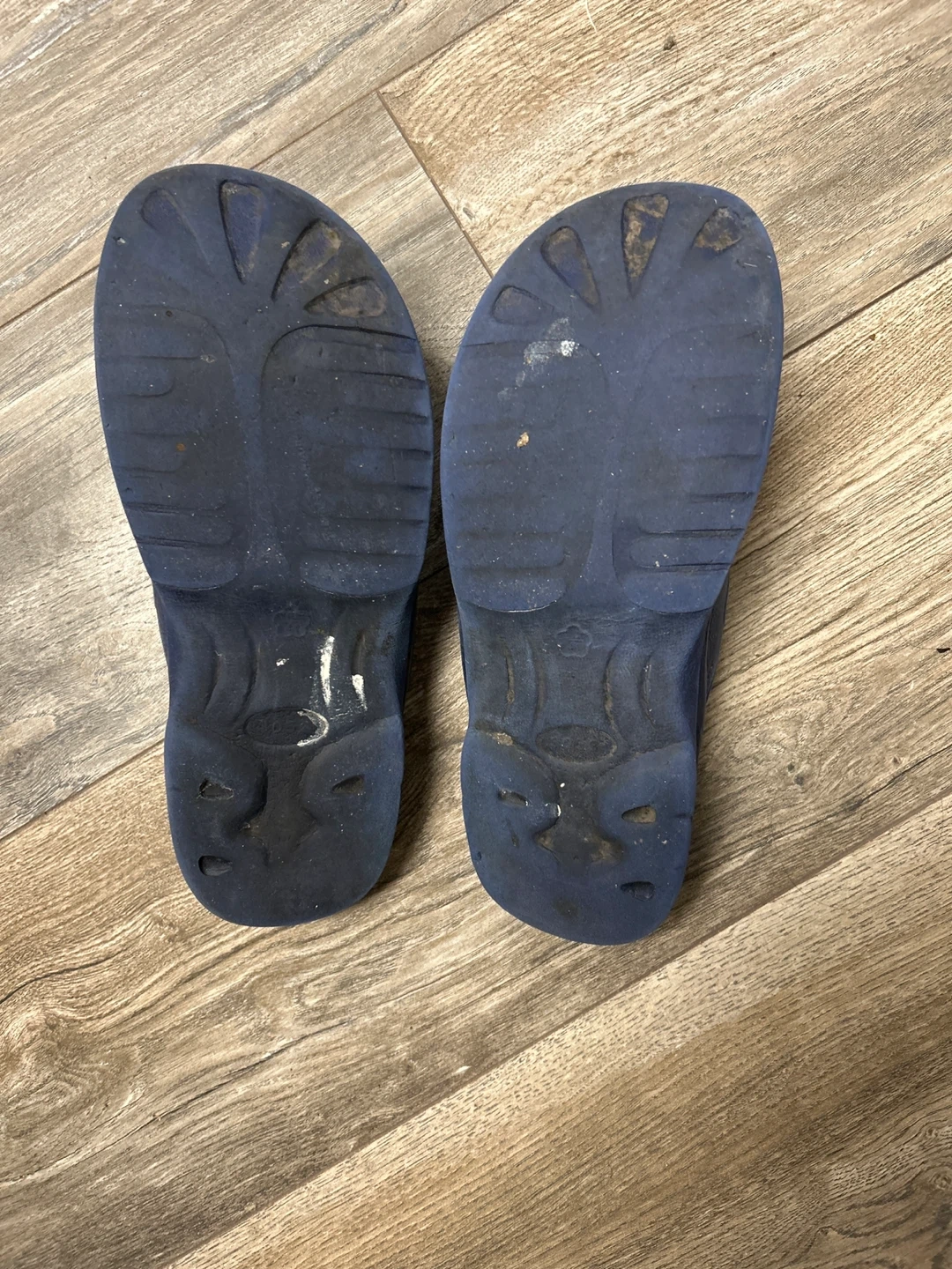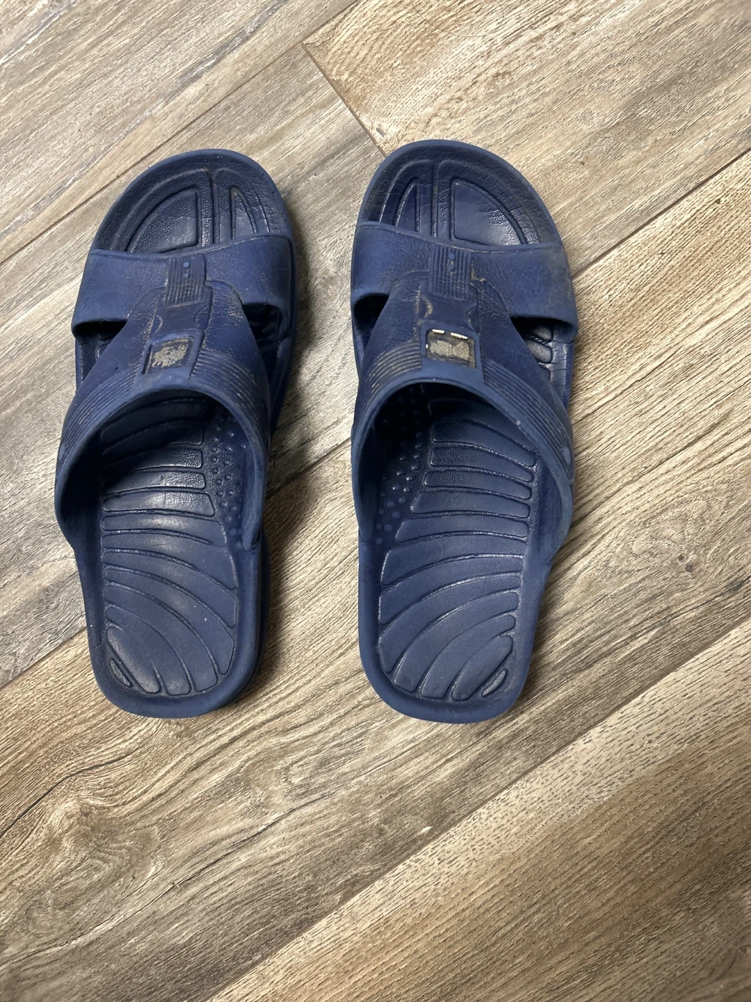 A pair of blue slide sandals. These are made of a durable synthetic material. Great for casual wear or after sports!