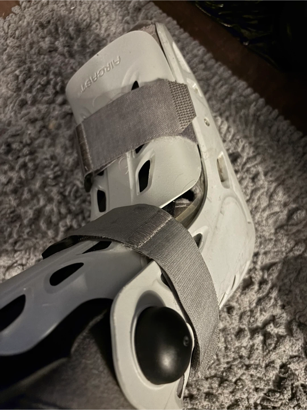 This is an Aircast walking boot, designed for ankle and foot support. It features adjustable straps for a secure fit. This boot is useful for recovery from injuries. It's made of durable plastic and nylon materials.