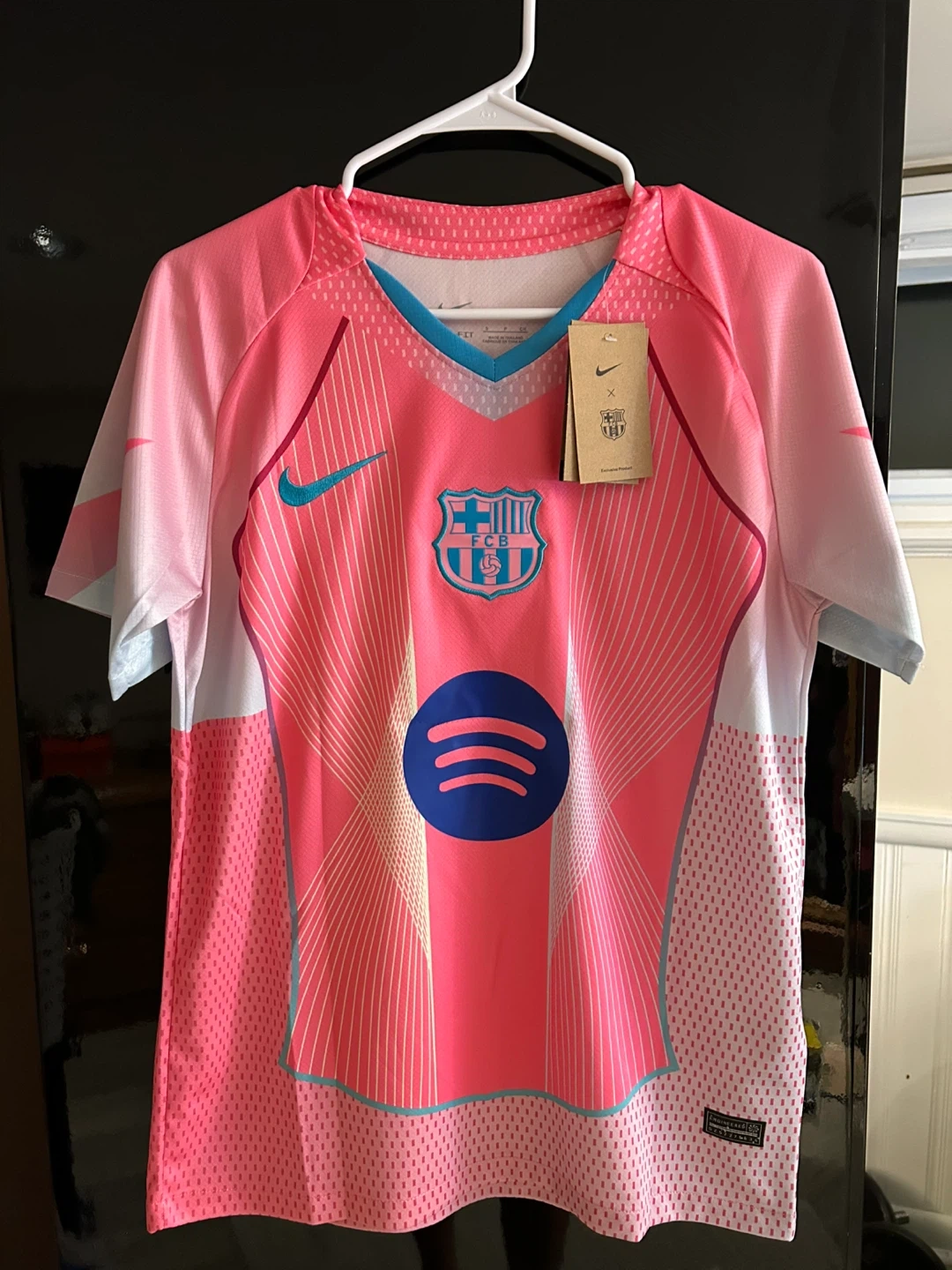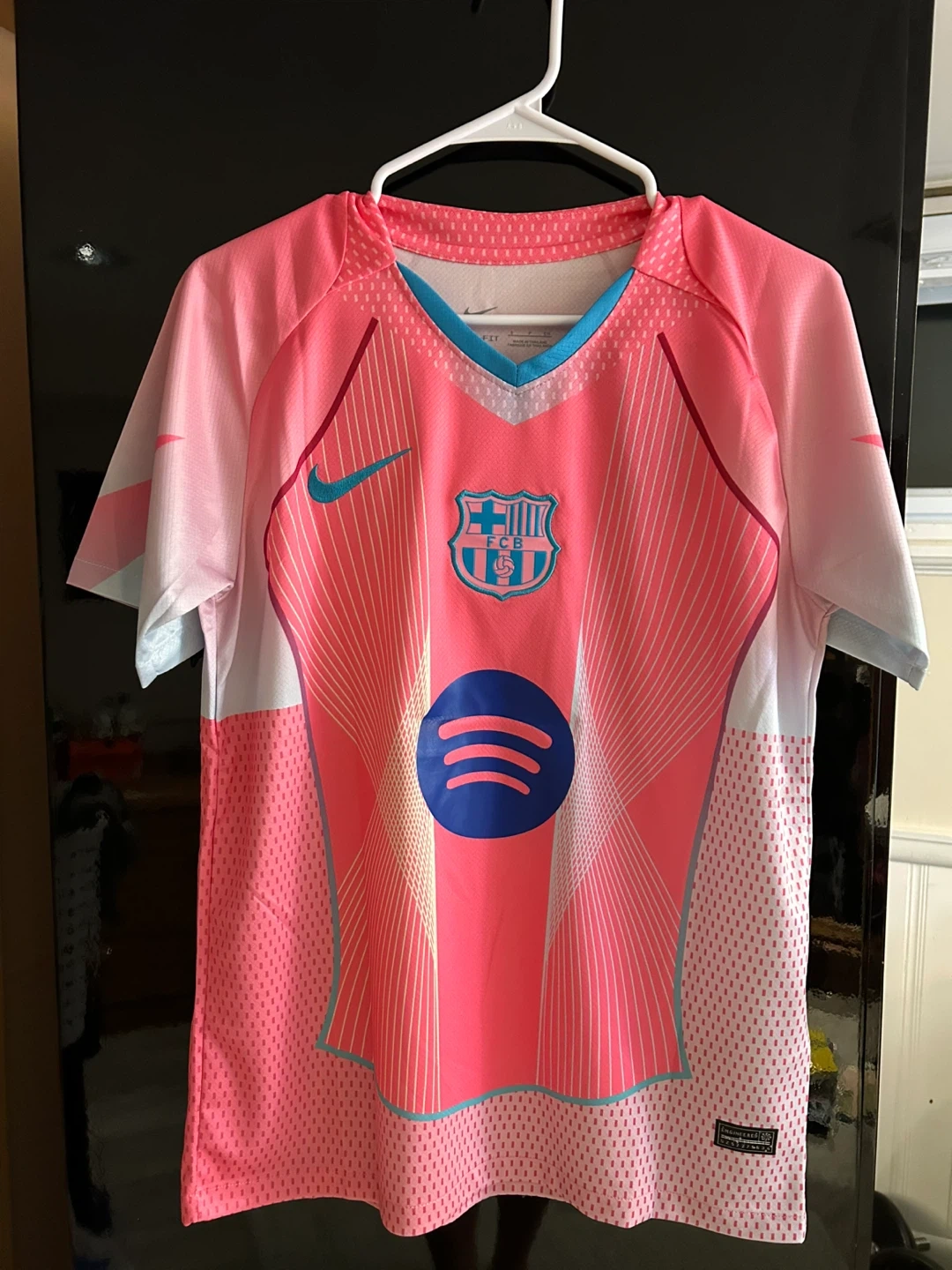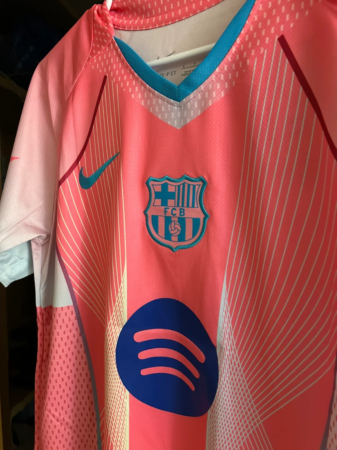 This is a Nike FC Barcelona jersey from the 2023-2024 season, featuring the Spotify sponsorship. It's made with Dri-FIT fabric for comfort. Great for any football fan!