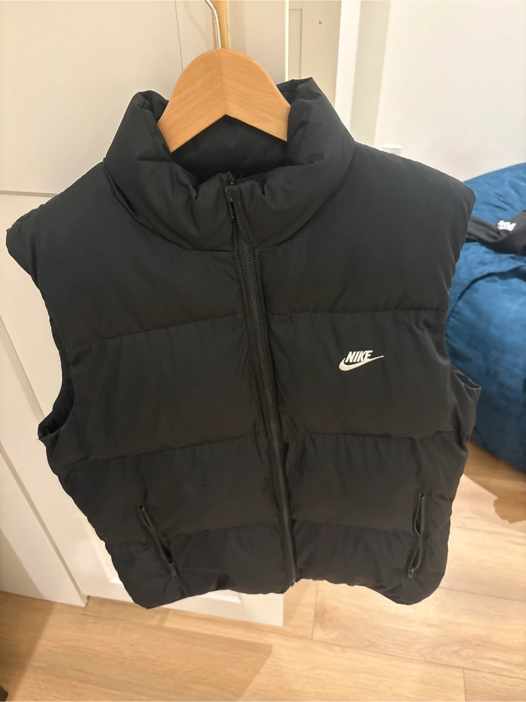 This is a black Nike puffer vest. It's sleeveless with a zip-up front and pockets. Made for comfort and style!