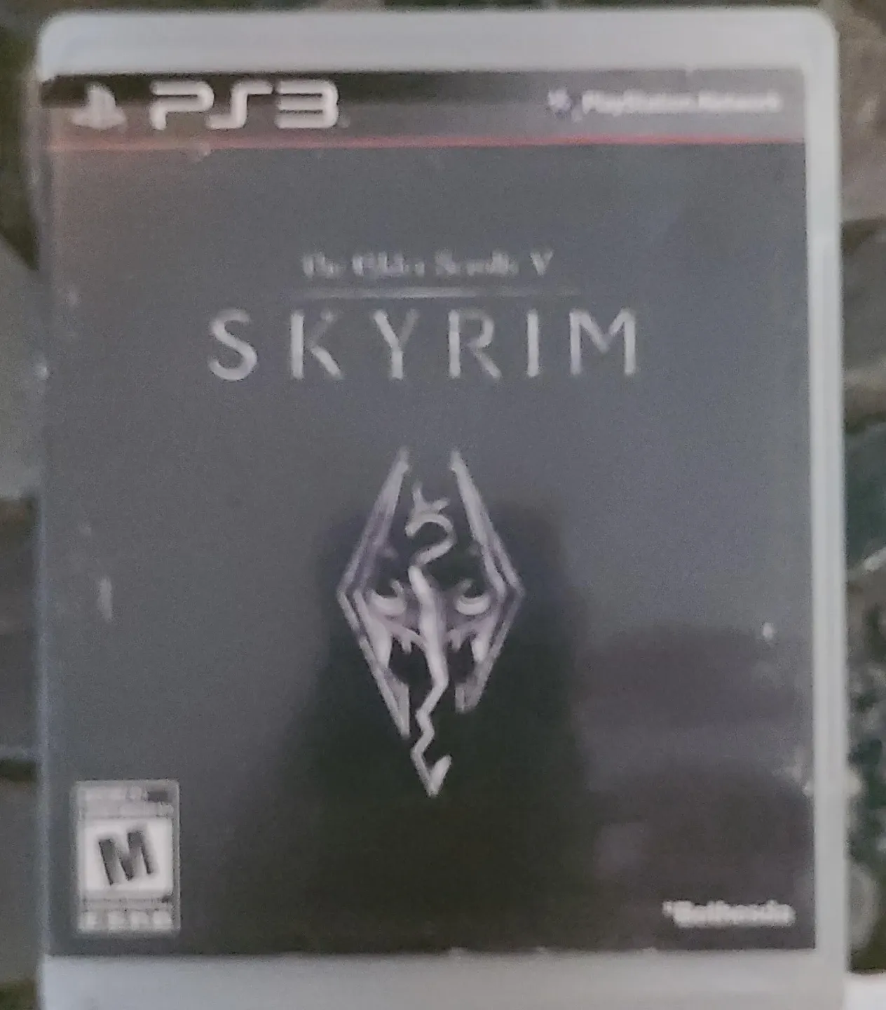 Playstation 3 game The Elder Scrolls V: Skyrim. This action-adventure role-playing game is rated M for Mature. It features a vast open world for players to explore.