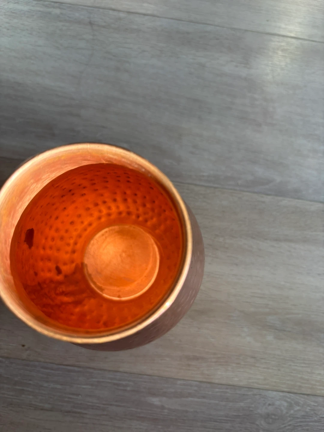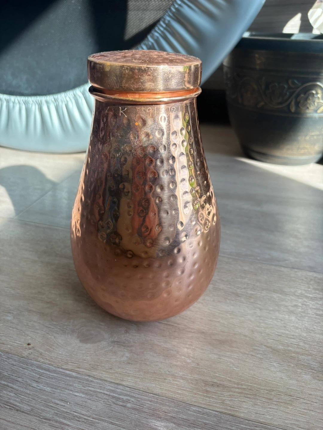 This is a copper water bottle with a hammered finish and a lid. Copper is known for its health benefits when used for drinking water. It's great for everyday hydration or for travel!