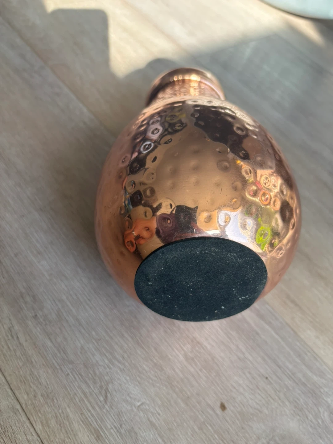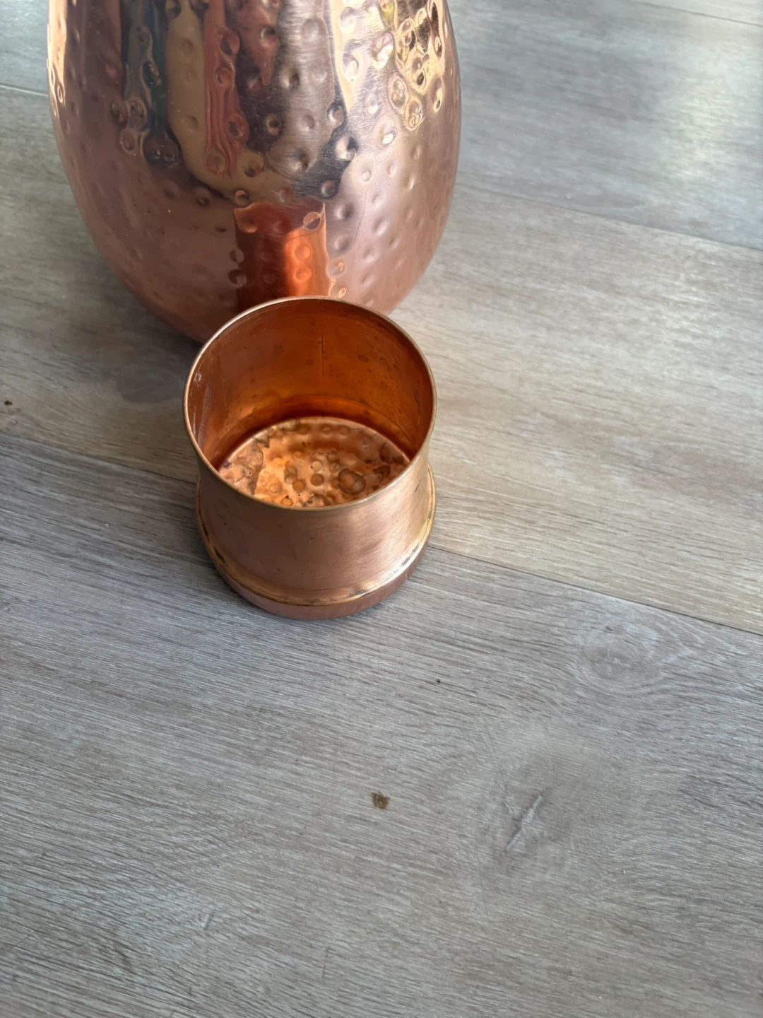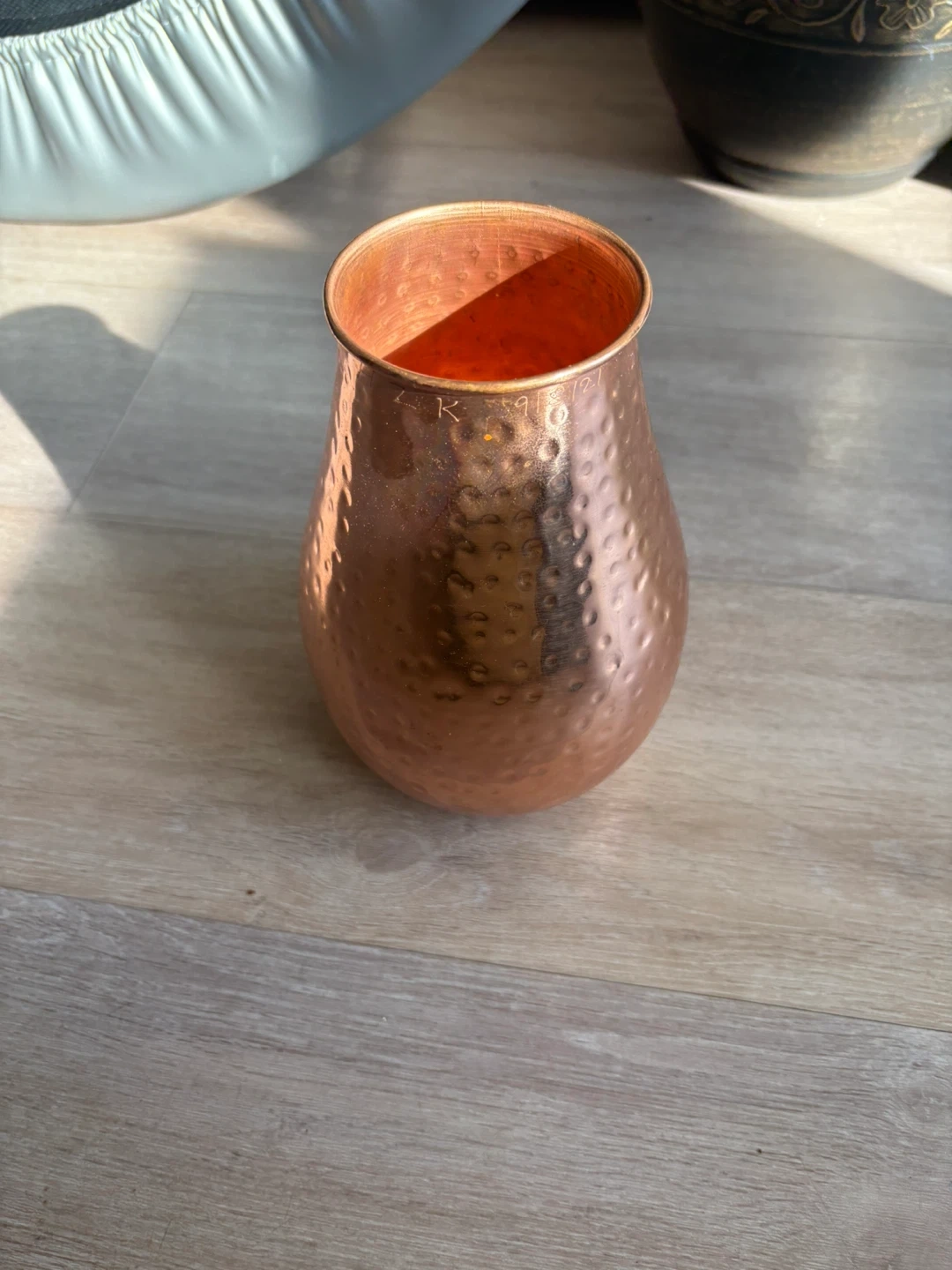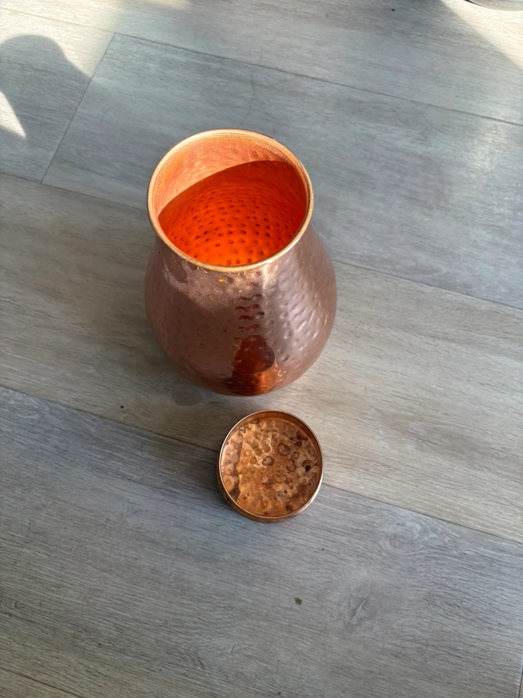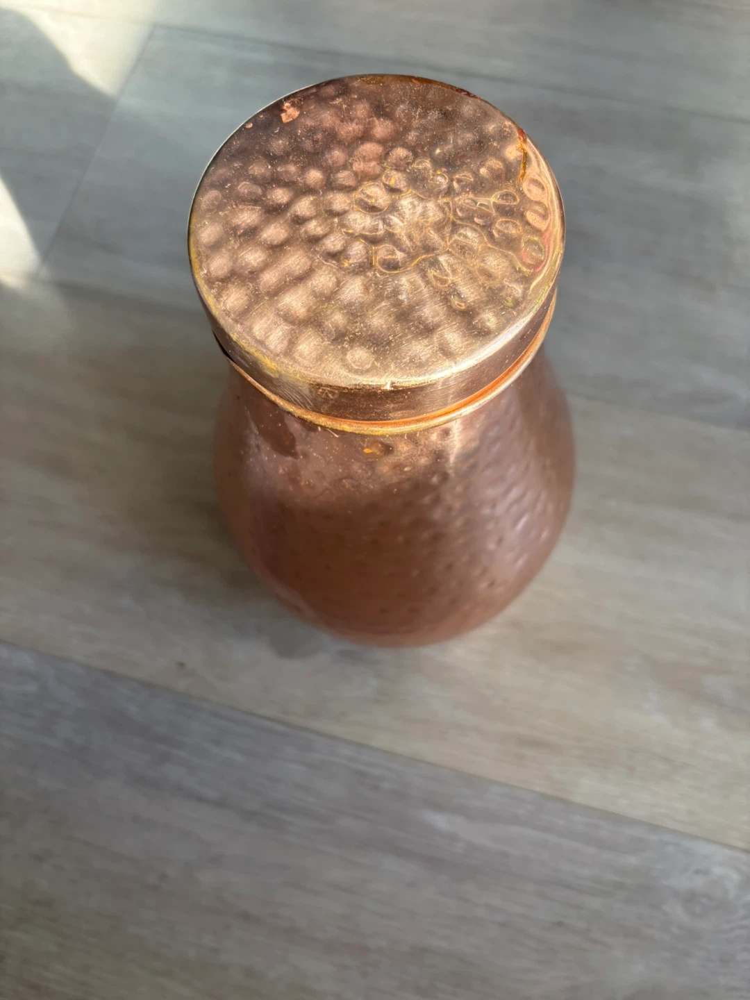 This is a copper water bottle with a hammered finish and a lid. Copper is known for its health benefits when used for drinking water. It's great for everyday hydration or for travel!