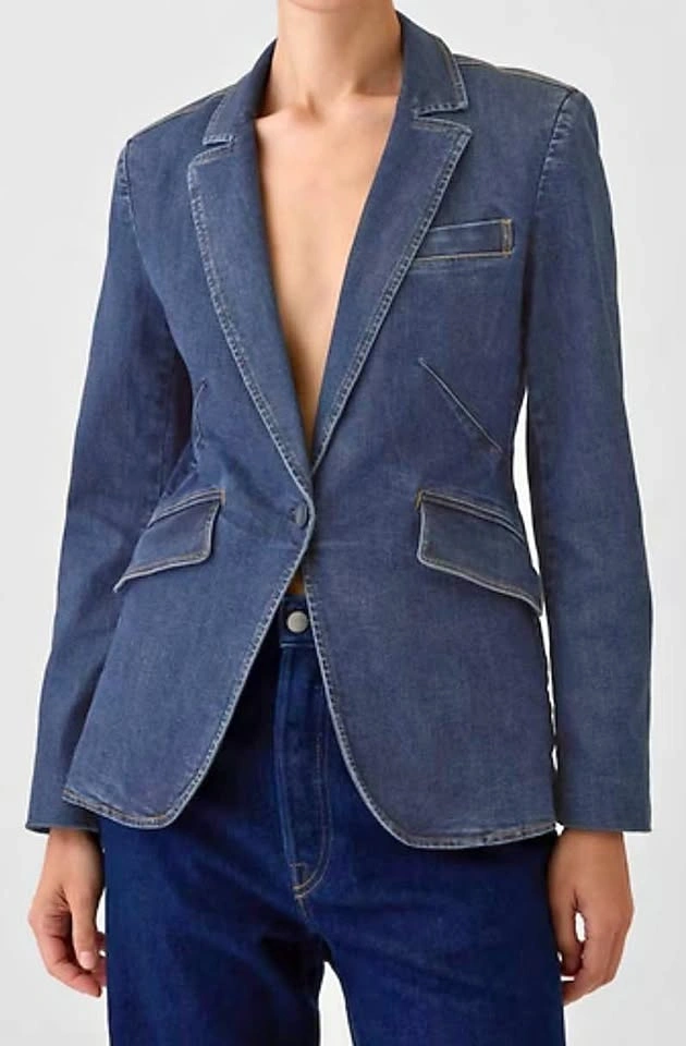 Soft, stretch denim blazer. V-neck with notch lapels. Long sleeves. Button front. Flap-welt pockets. Slit at the back. Fit: Close to the body. Hits at the hip.