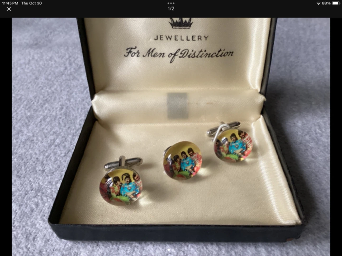Beatles Sgt Pepper themed cufflinks and tie pin set. Features images of the band. Comes in a jewellery presentation box. Excellent condition!