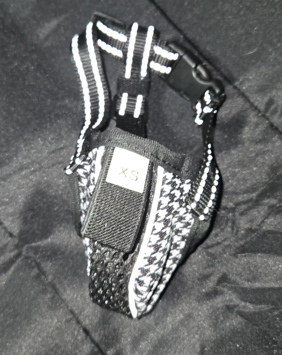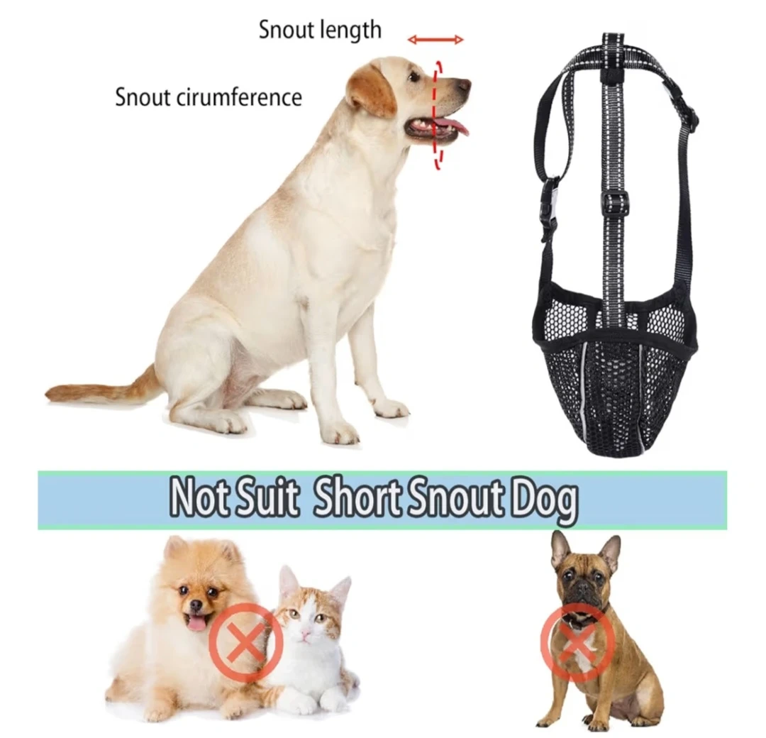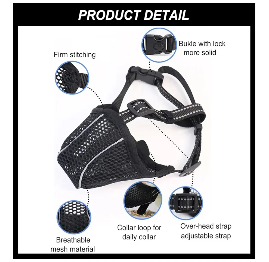 Breathable mesh dog muzzle with firm stitching and reflective straps. It features a quick-release buckle and adjustable straps for a secure fit. Collar loop included for daily collar attachment. Not suitable for short snout dogs.