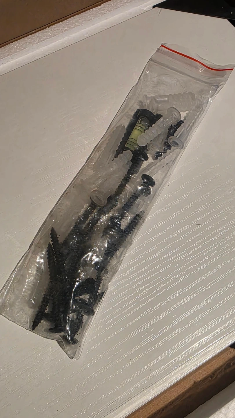 The box has been opened, but the shelves themselves are still sealed in a protective wrap. Mounting hardware is included for easy installation.