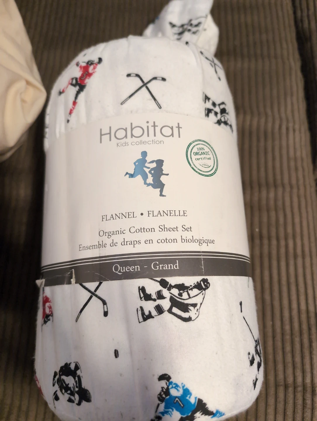 Habitat Kids organic cotton flannel sheet set. It's 100% organic certified and features a hockey-themed print. Queen size.