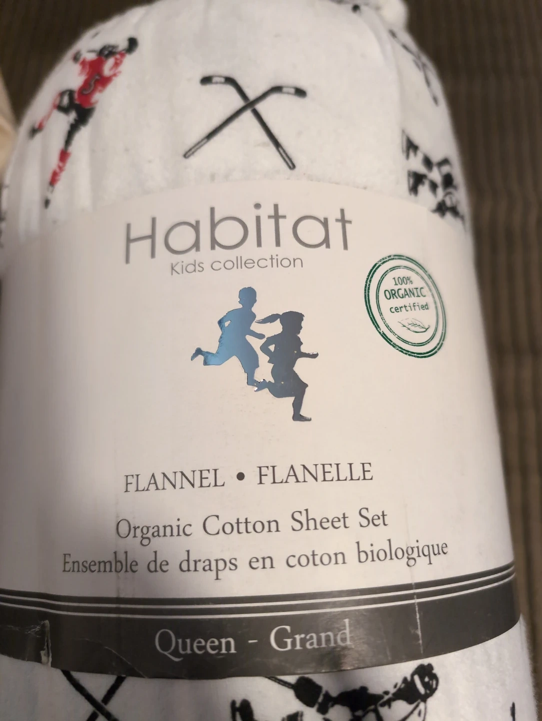 Habitat Kids organic cotton flannel sheet set. It's 100% organic certified and features a hockey-themed print. Queen size.