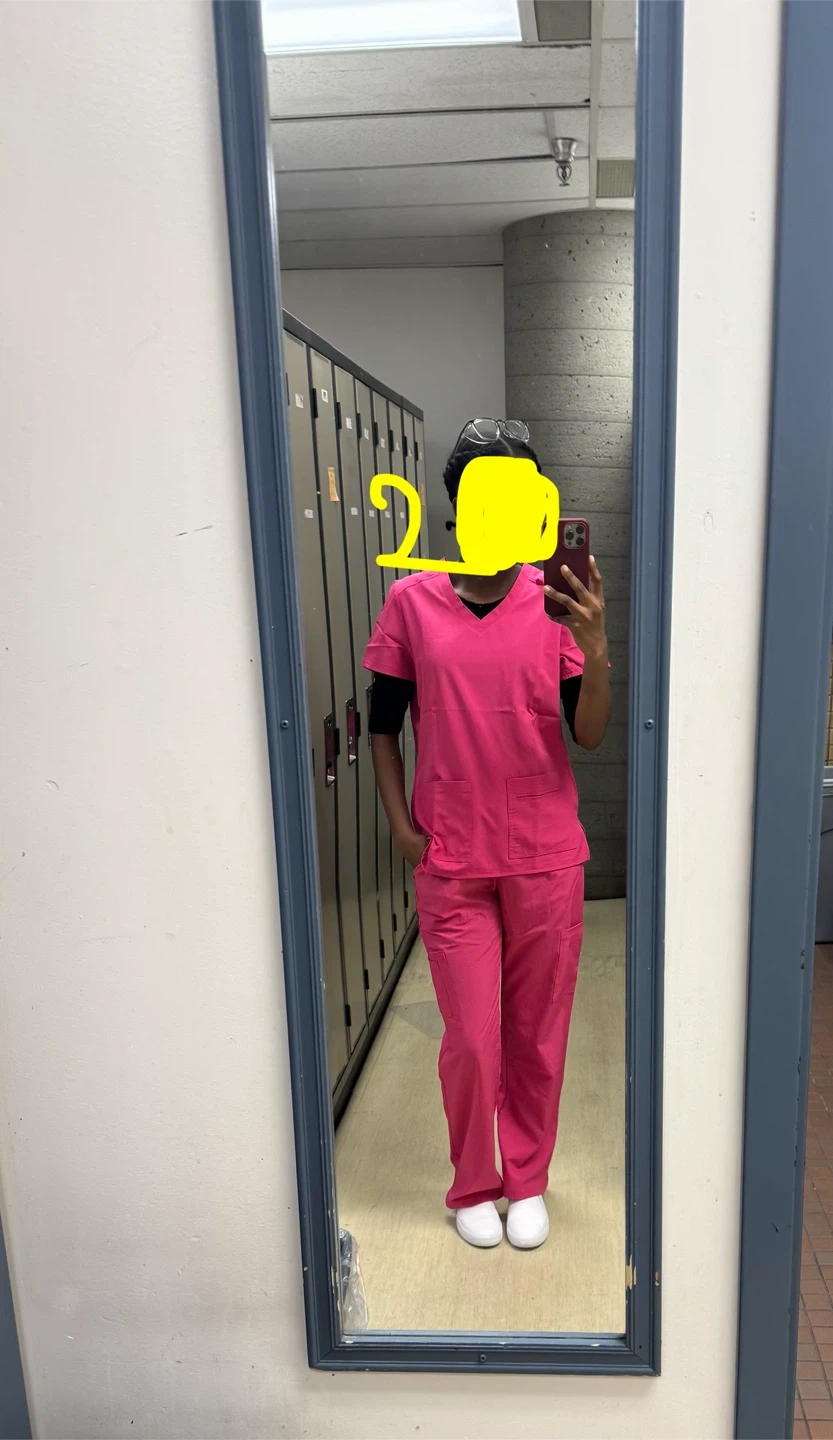 A v-neck scrub top and matching scrub pants in a vibrant pink colour. It's a comfortable and practical set for work. The set includes a top with pockets and matching drawstring pants.
