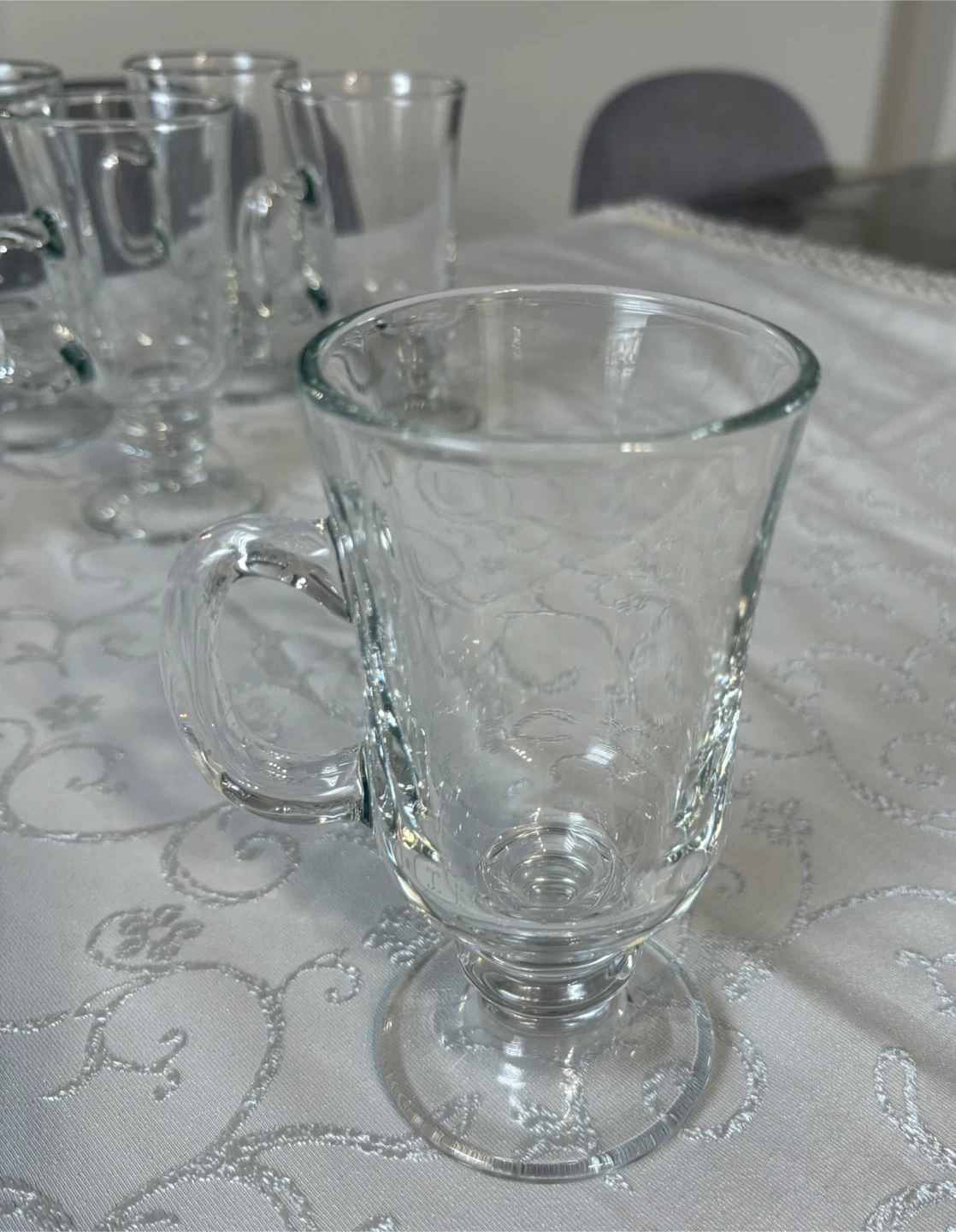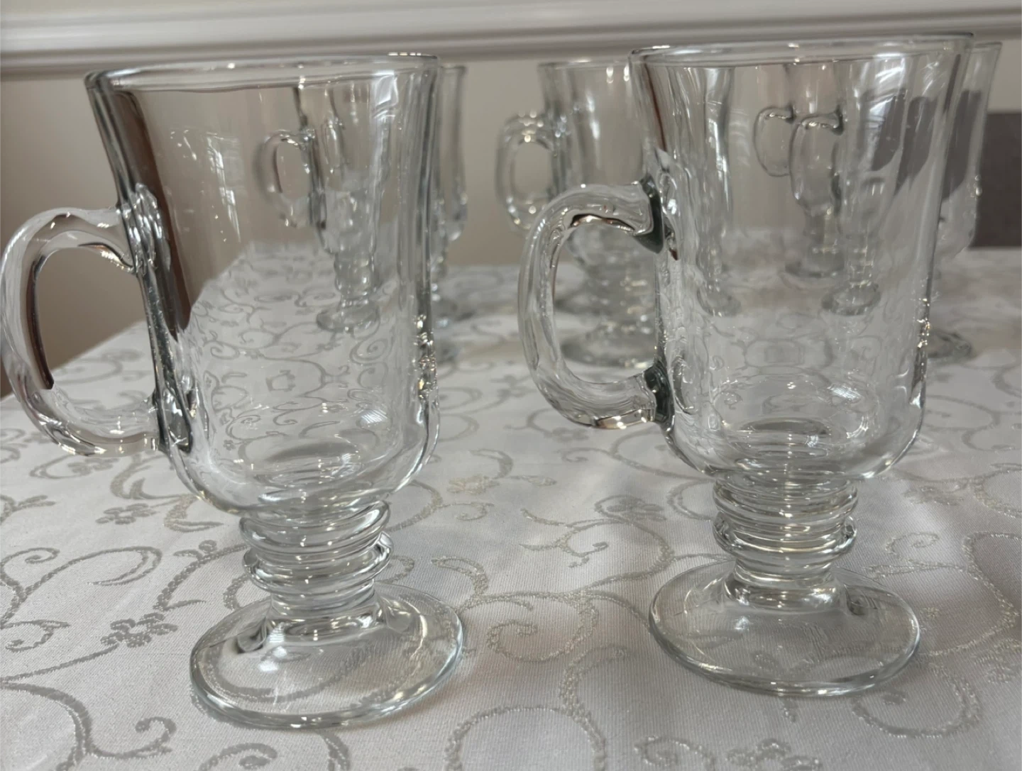 These clear glass mugs are perfect for serving Irish coffee or any hot beverage. Each mug features a sturdy handle and a classic design with a stemmed base. Set includes 8 mugs.