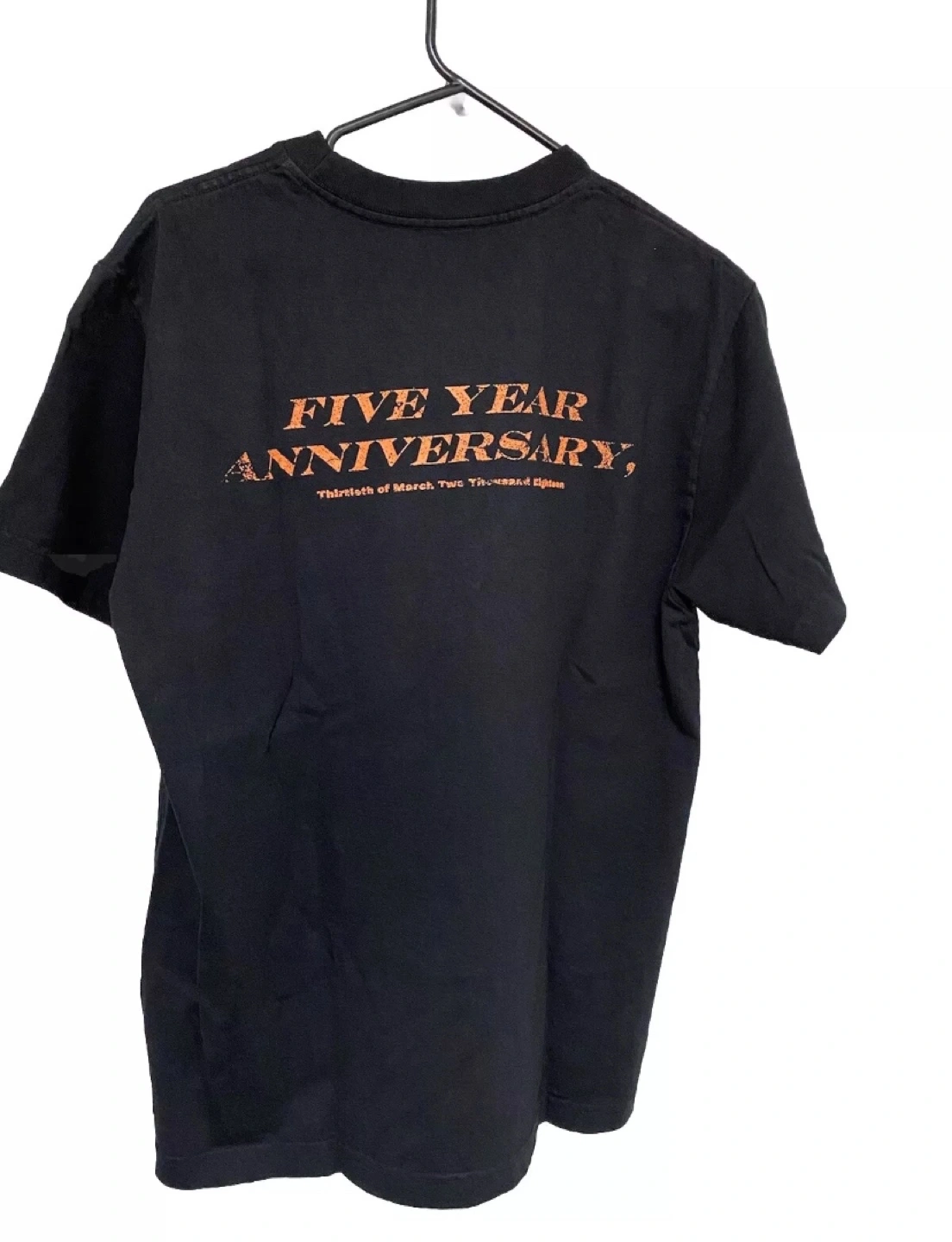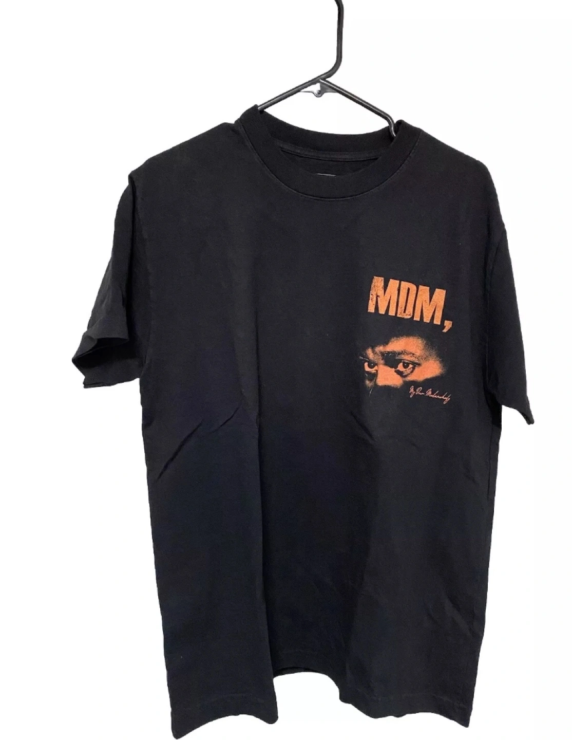 Black T-shirt with orange print. Features a graphic on the front and text on the back.