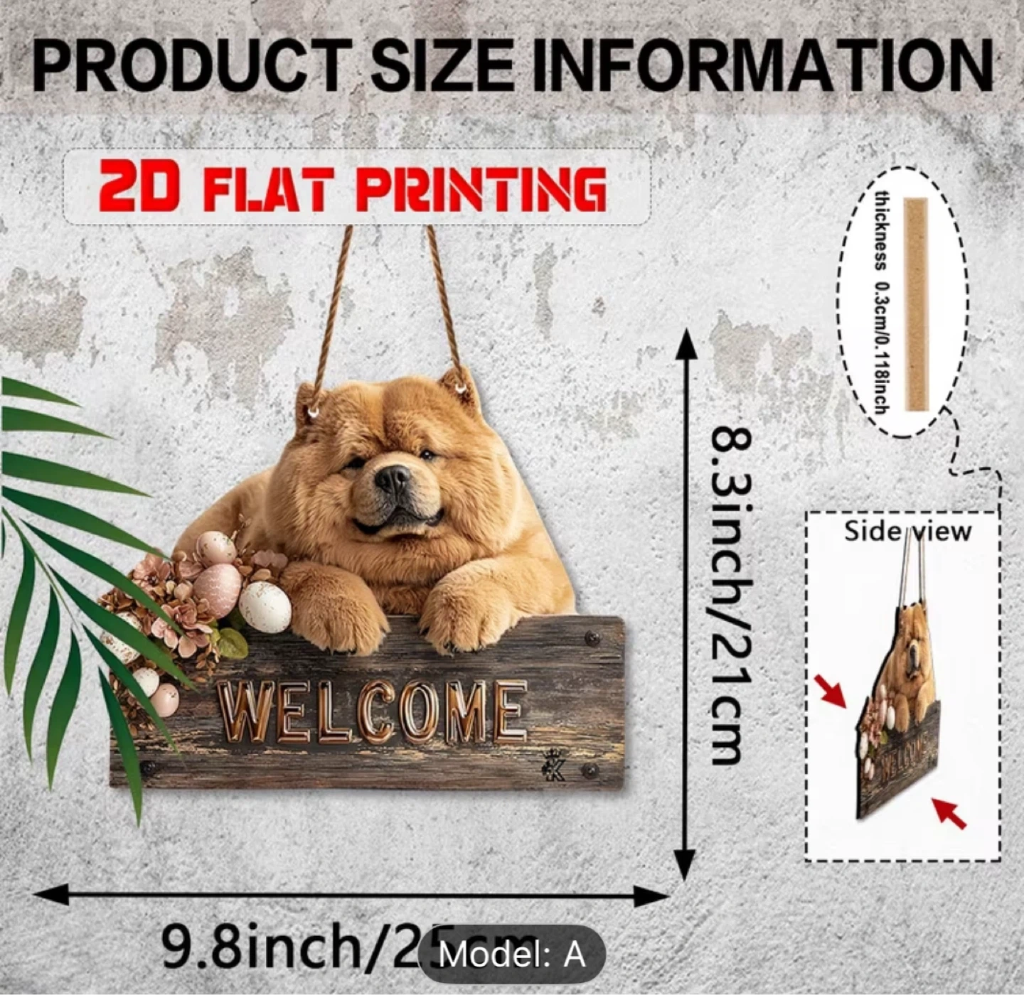 A charming wooden welcome sign featuring a fluffy Chow Chow dog. It measures 9.8 inches wide by 8.3 inches tall, with a thickness of 0.3cm. This sign's design includes a floral accent with eggs, perfect for adding a touch of warmth to your home's entrance.