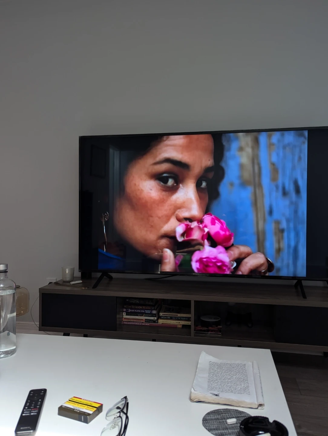 Sony Brava Google 4K UHD Smart TV. It's a big screen for your living room. Comes with a remote.
