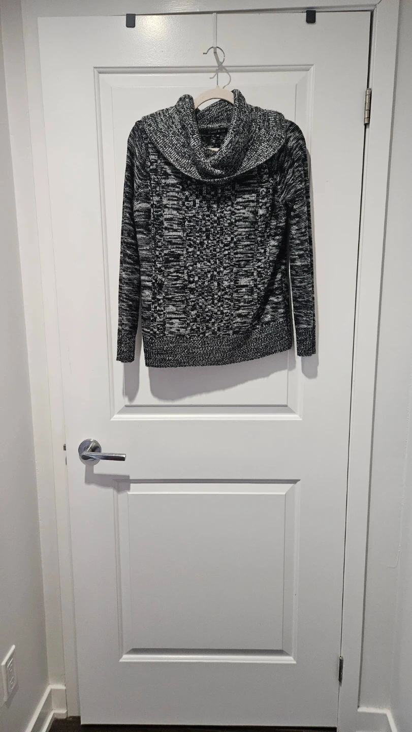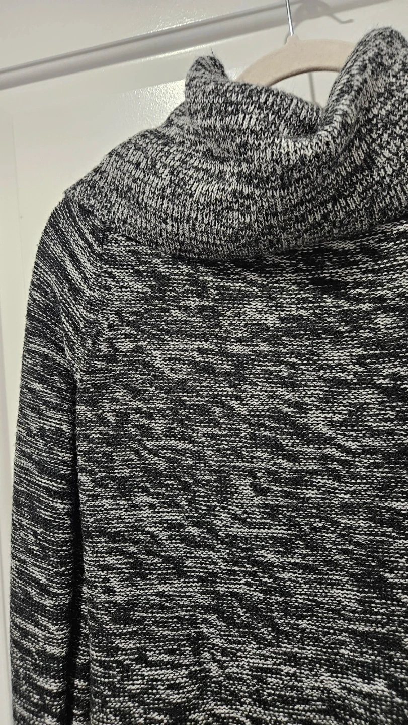 Size medium cozy cowl neck sweater in a textured knit pattern. It's made from a blend of materials for comfort and warmth. Looks great with jeans for a casual outing!