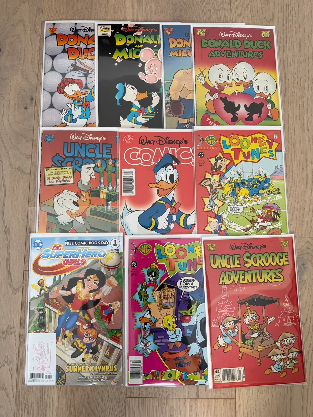 This lot includes Walt Disney's Donald Duck comics, Looney Tunes, and DC Superhero Girls. Featured titles are Donald Duck Adventures, Uncle Scrooge Adventures, and a Free Comic Book Day edition of DC Superhero Girls, Summer Olympus.