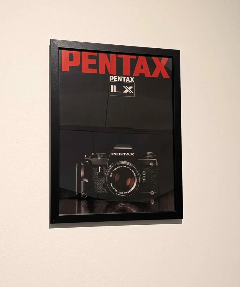 This is a framed print of a Pentax ILX camera. The print displays the camera in black and white with red lettering for the brand. It's framed in a simple black border. This would look great in a photo studio or as a gift for a photography enthusiast!