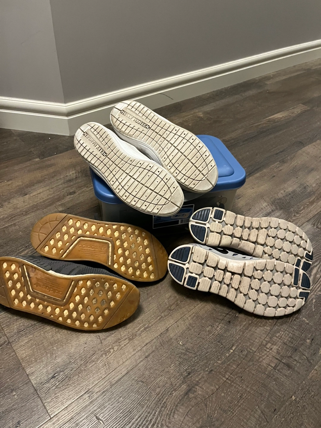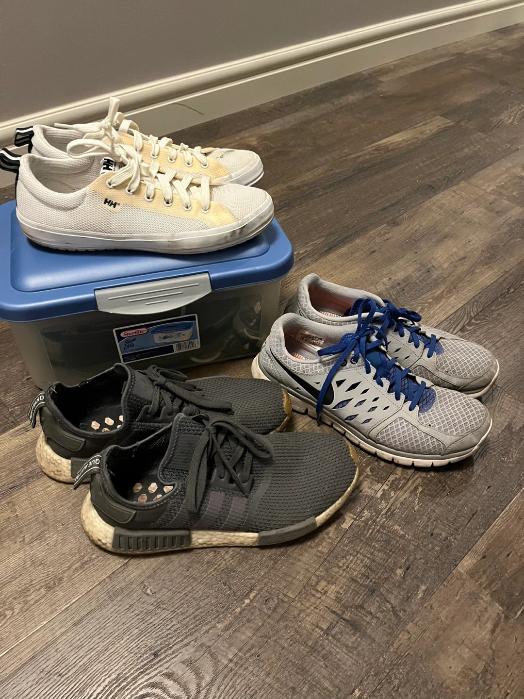 Three pairs of used shoes. One pair of Adidas NMD R1 sneakers, dark grey colour. One pair of white canvas shoes, brand HH. One pair of grey Nike running shoes. Shoes show wear.