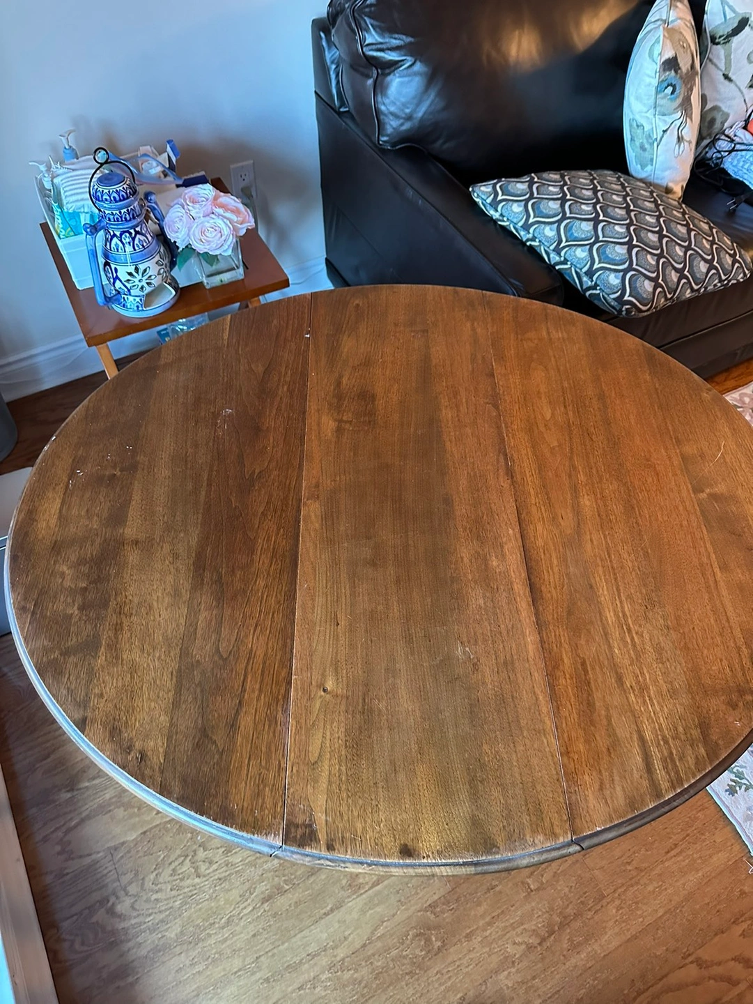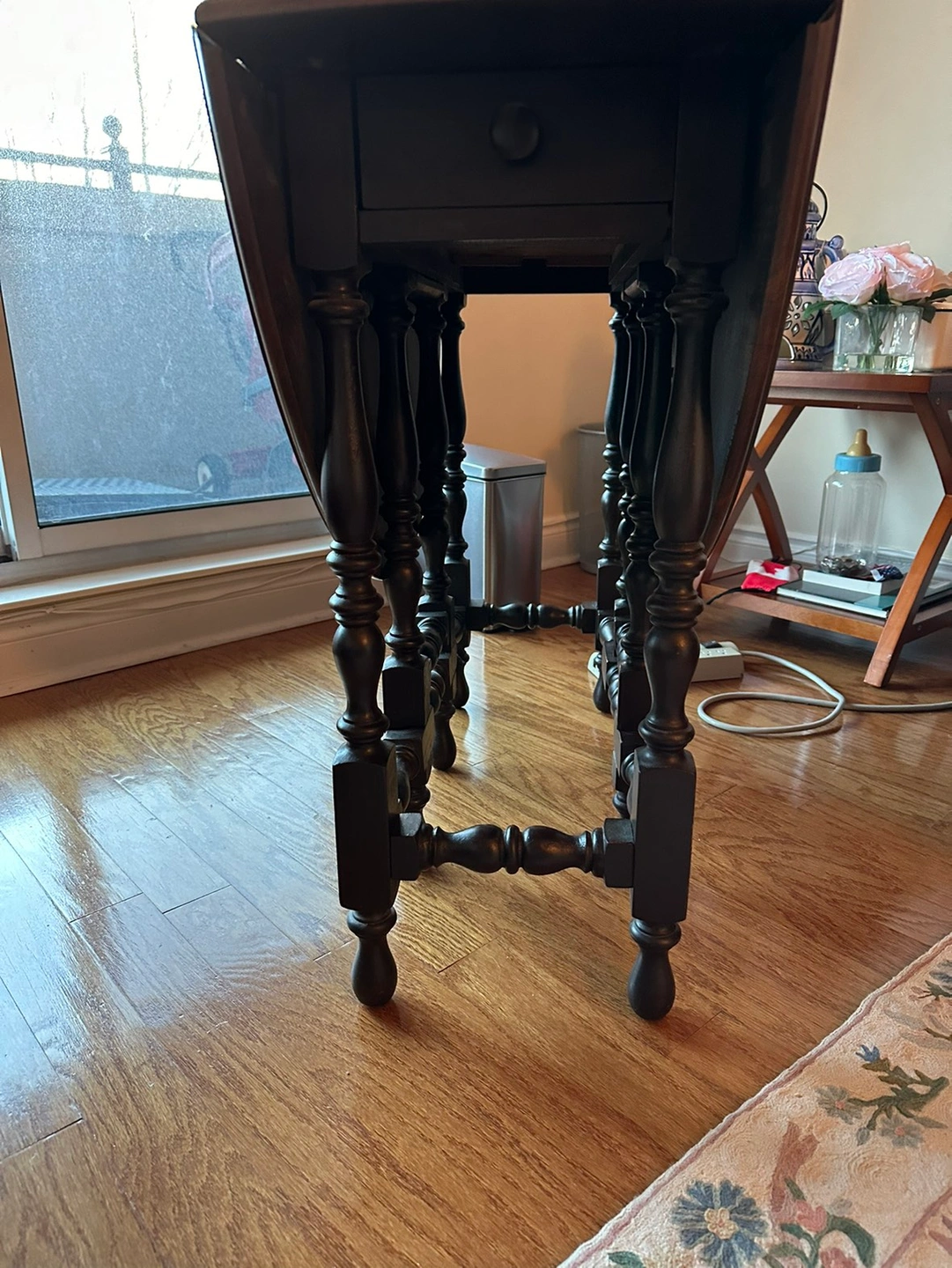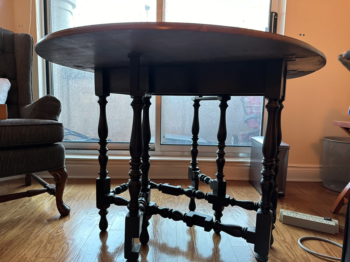 Sold wood drop leaf table folds to 13 x 38 in. Lovely oval shape can fit up to 6 people. Perfect for condos/ apt or extra large families!!