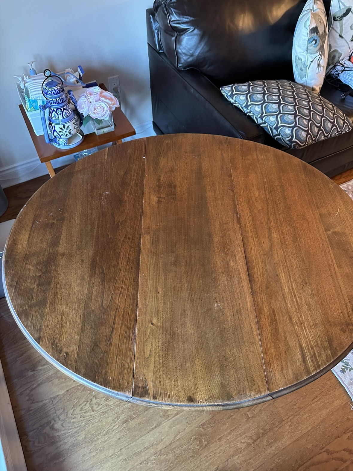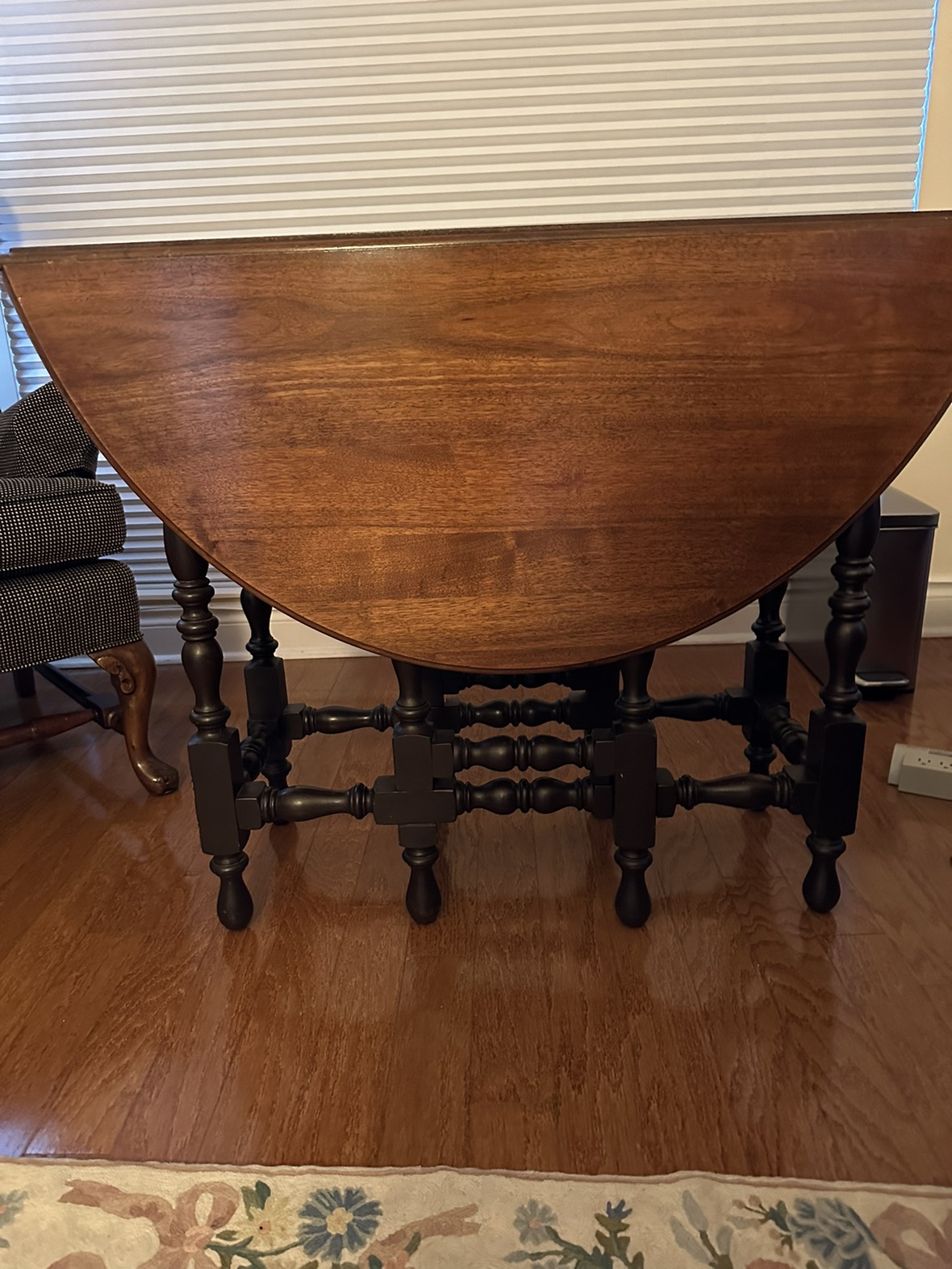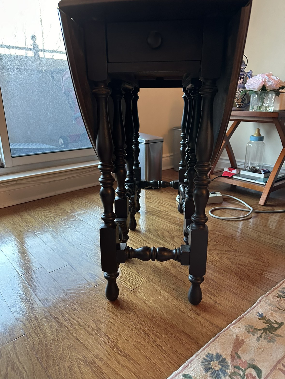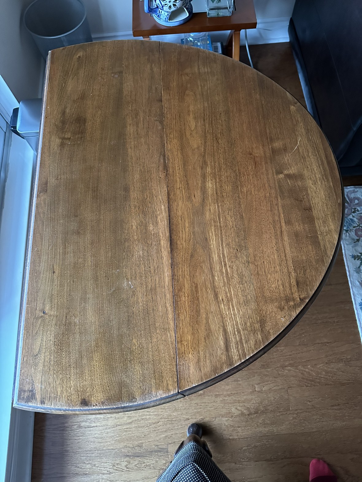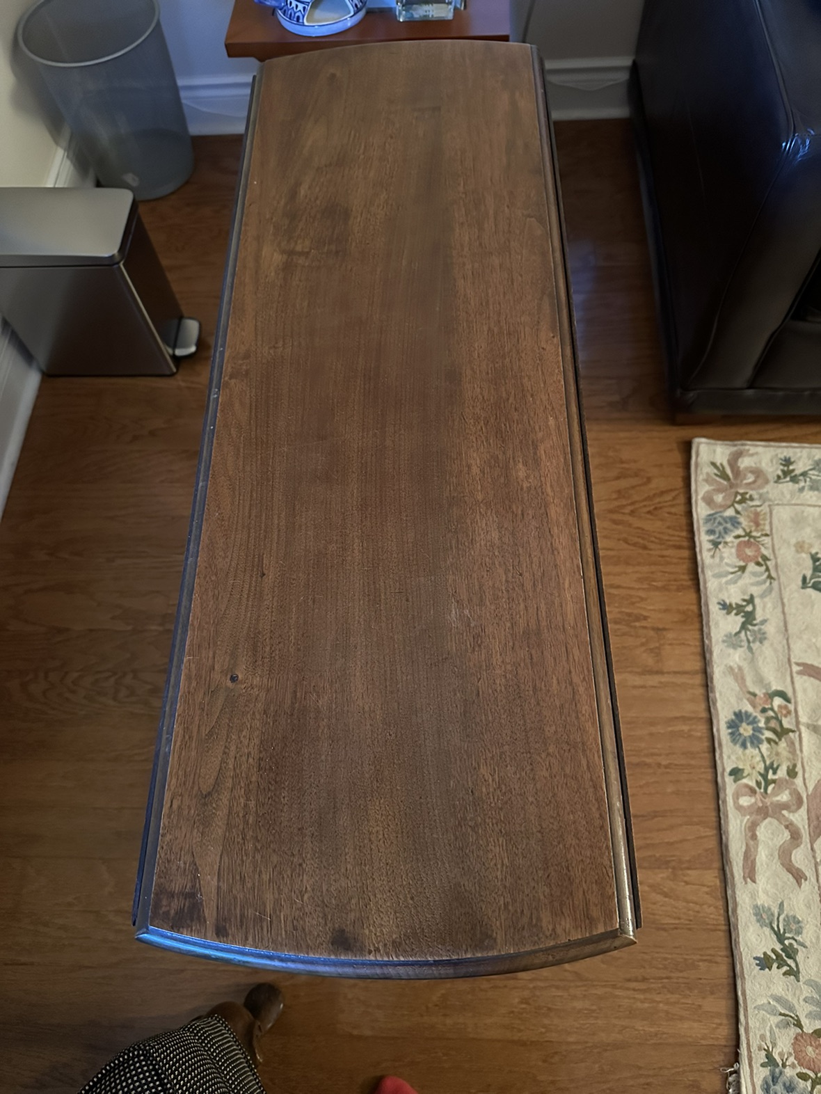 Sold wood drop leaf table folds to 13 x 38 in. Lovely oval shape can fit up to 6 people. Perfect for condos/ apt or extra large families!!