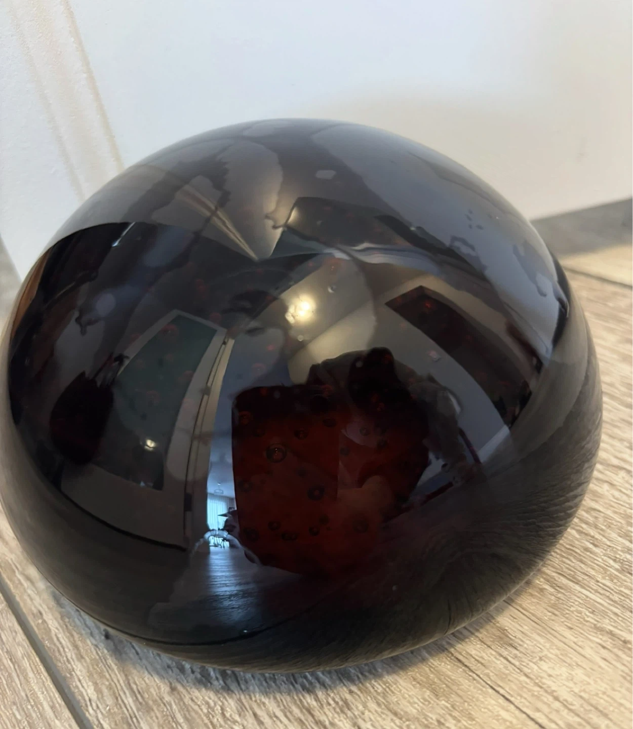 This is a dark, reflective sphere with red inclusions. It's a beautiful accent piece for any home. The smooth, polished surface catches the light well.