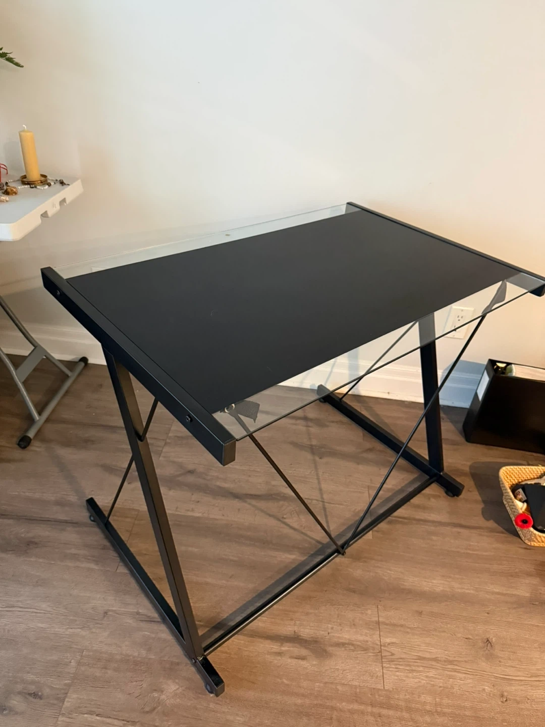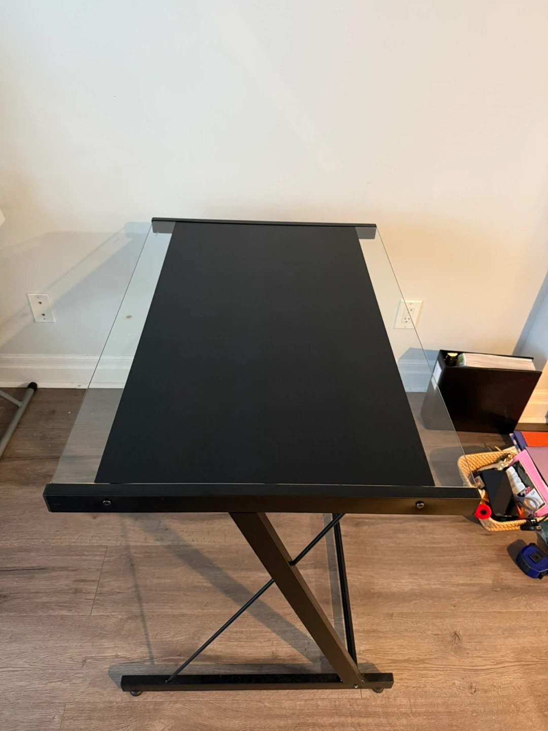 A stylish black desk featuring a matte black desktop and clear glass side panels. Its metal frame provides a sturdy base. This desk is great for a home office or study space.