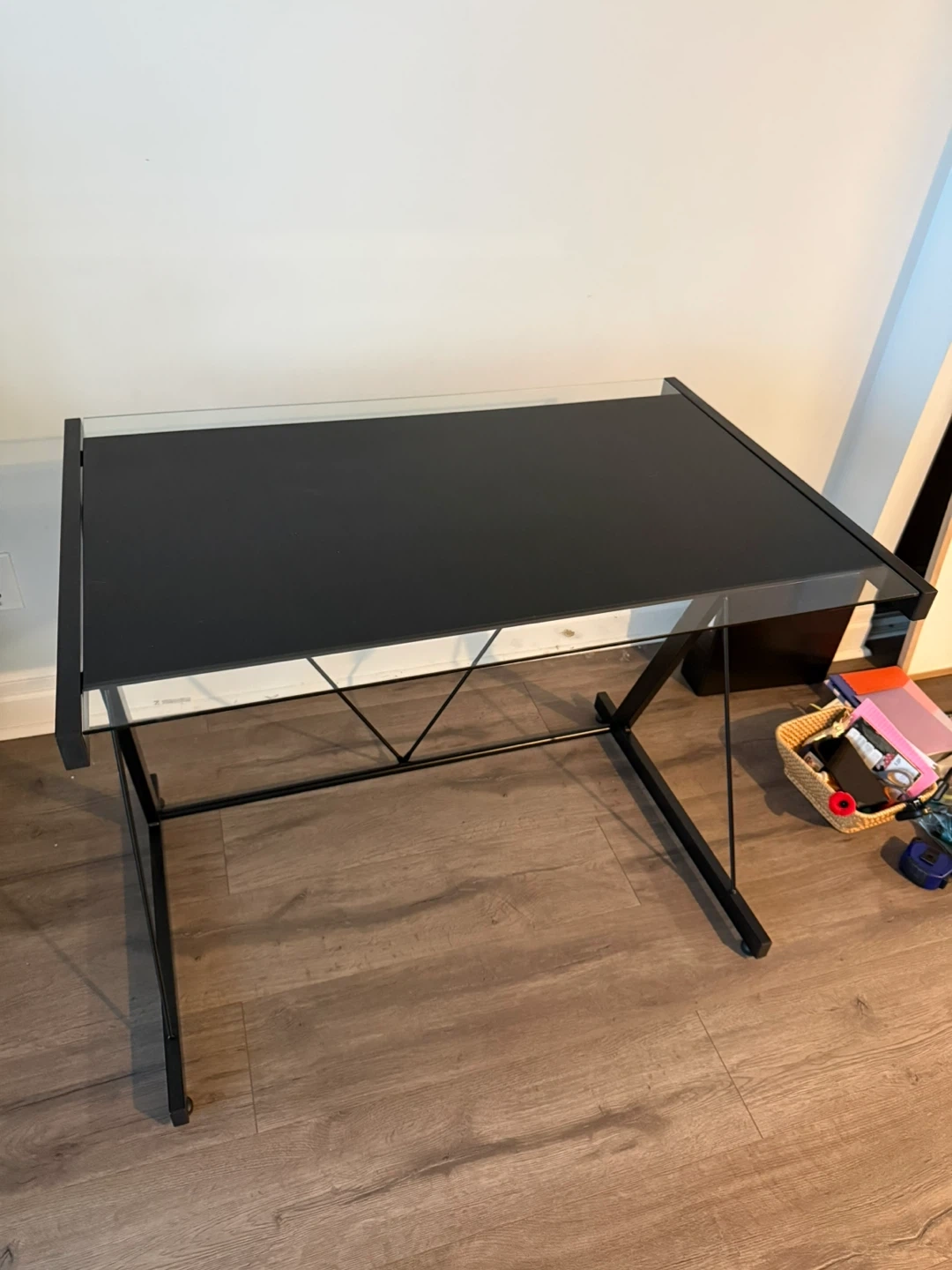 A stylish black desk featuring a matte black desktop and clear glass side panels. Its metal frame provides a sturdy base. This desk is great for a home office or study space.