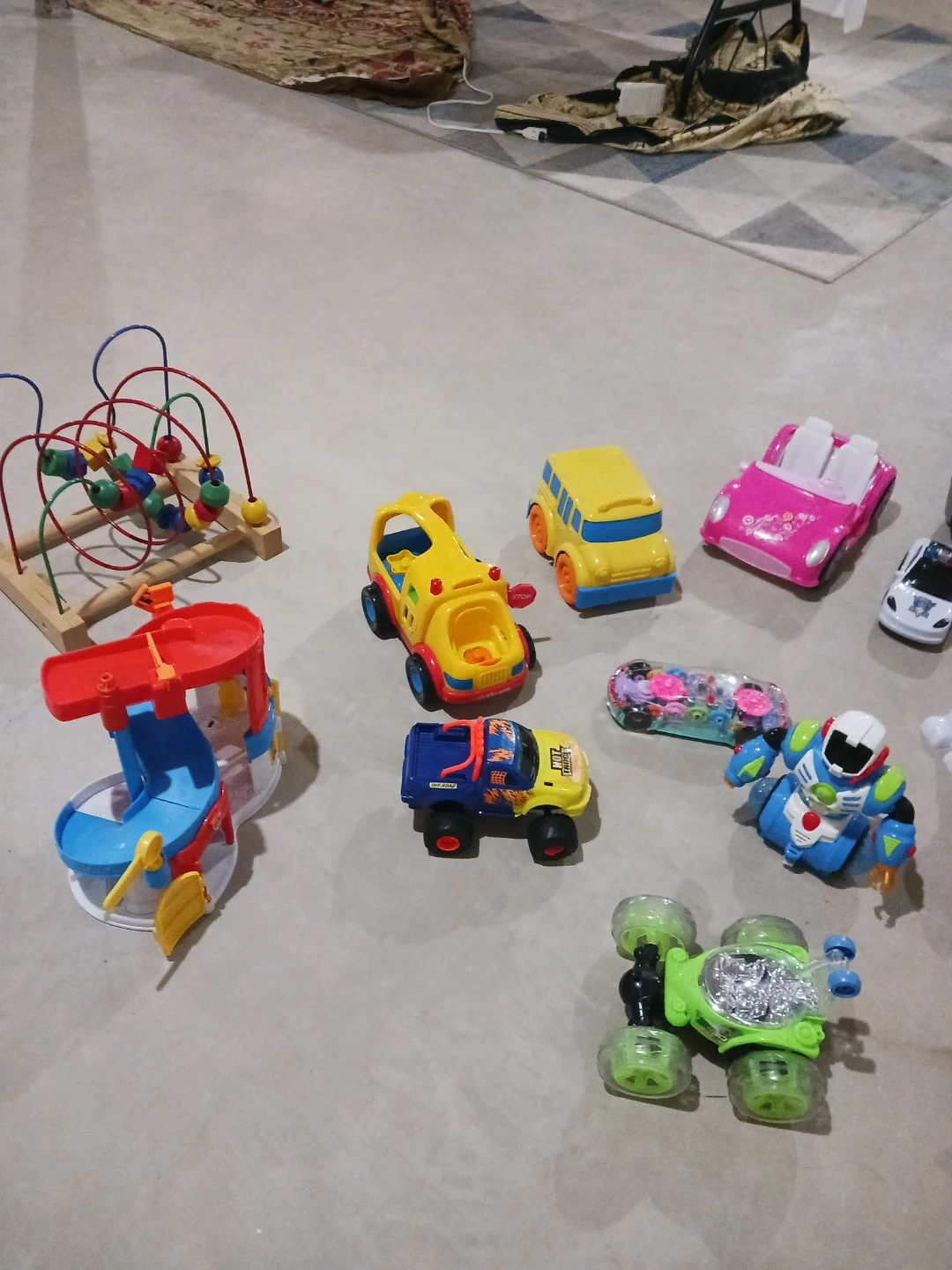 Includes a variety of toy cars, a fire truck, a robot, an airplane, and several action figures. Also features a wooden bead maze toy. Great for imaginative play!