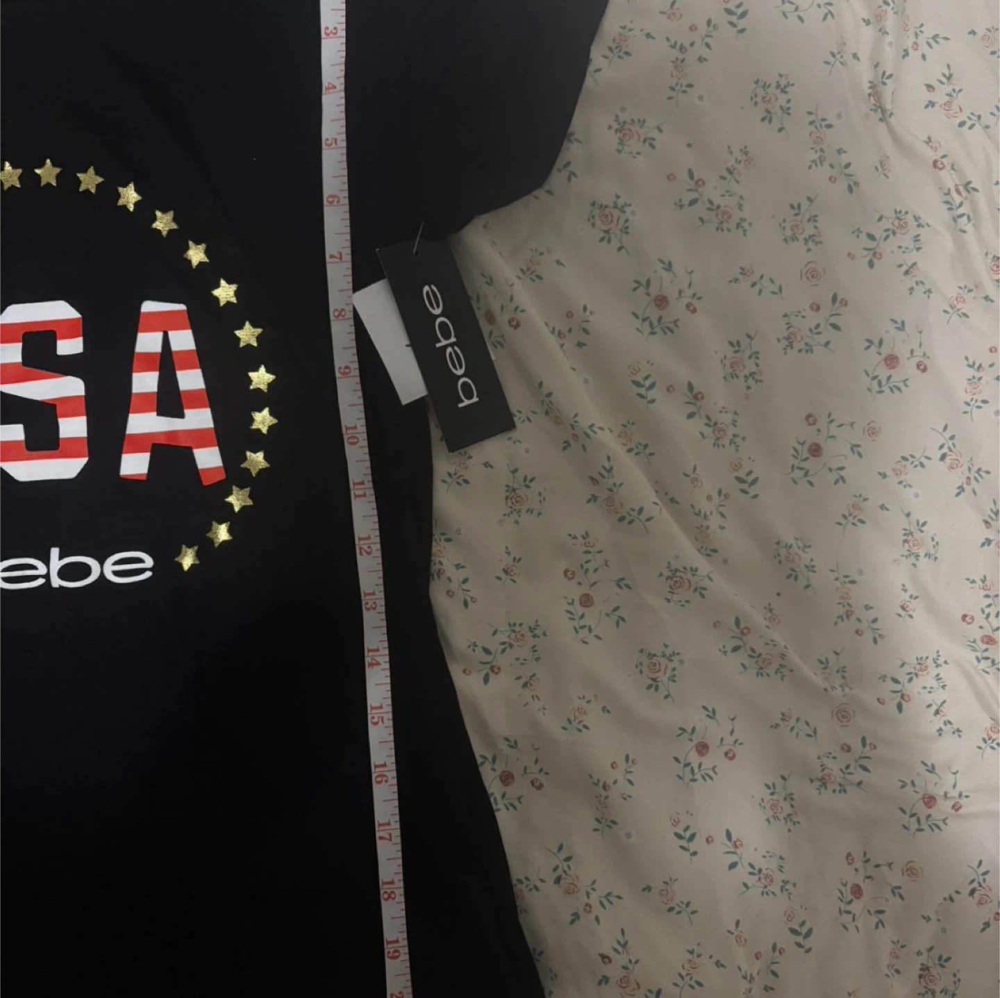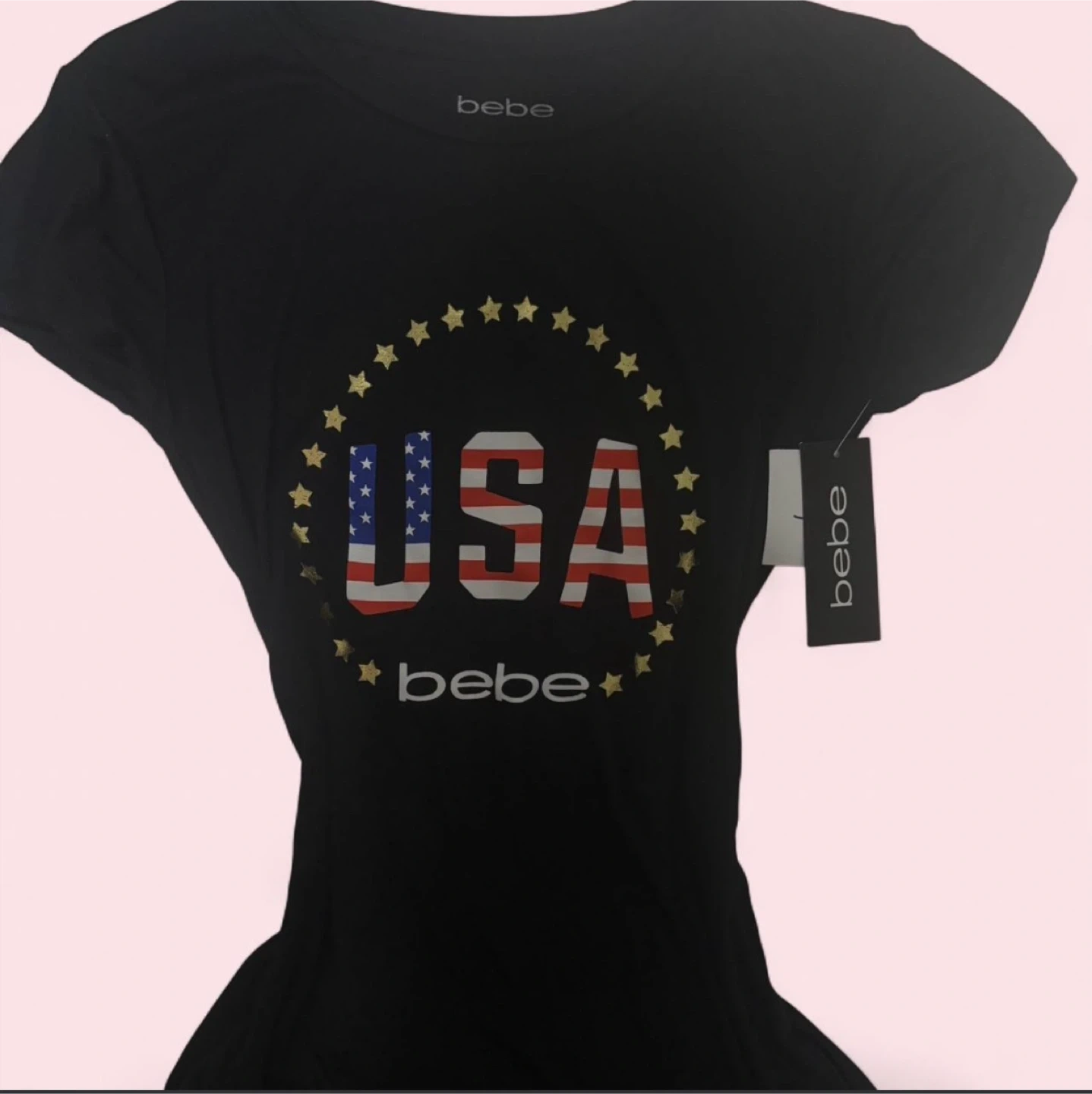 With tags This is a black Bebe t-shirt with a USA graphic design. It's a size small. The shirt is made from a soft material. #y2k#bebe#aeropostale#hollister#fitch