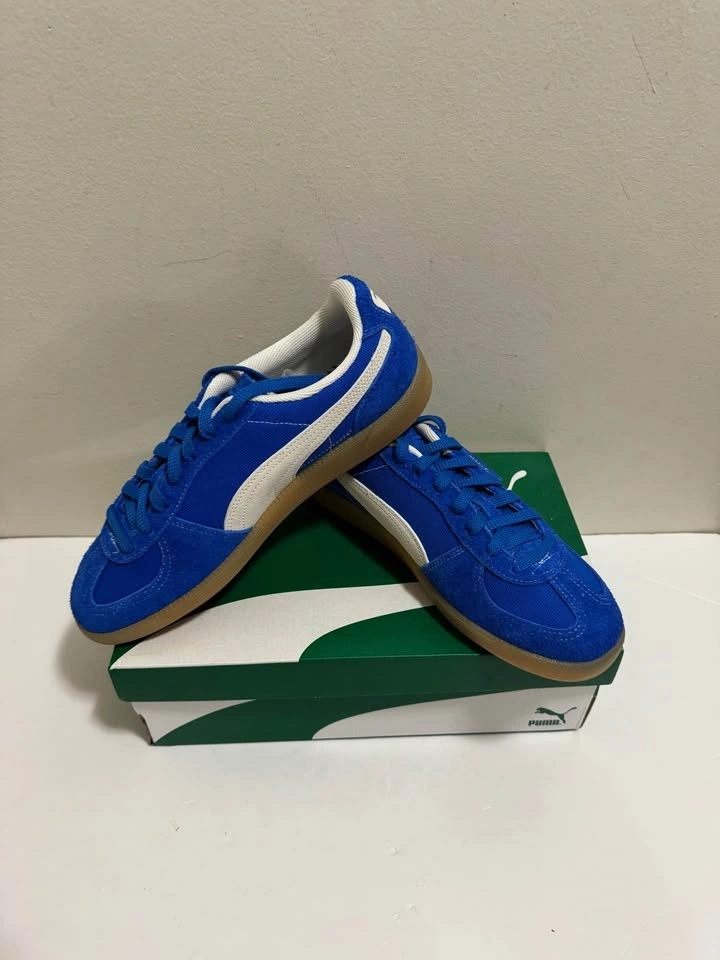 Vibrant blue Puma Palermo sneakers for sale. These kicks are made with suede and canvas, featuring a classic white stripe and gum sole. Comes with the original box. Pick up only. Located near Brampton Gateway Terminal and Shopper World Mall Brampton. Address provided upon pickup confirmation. Cash only.