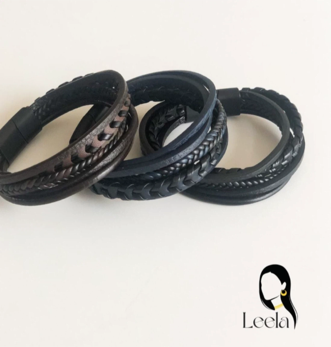 Here's a stylish set of faux leather bracelets! They come in a braided design and a mix of brown,blue and black colours. Perfect for adding a touch of sophistication to any outfit