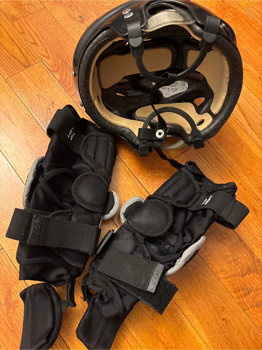 This is a JOFA 690 certified hockey helmet in black. It's a size L, fits head sizes 58-63 cm. Also included are a pair of black and grey STX EXO elbow pads. Great set for playing hockey!