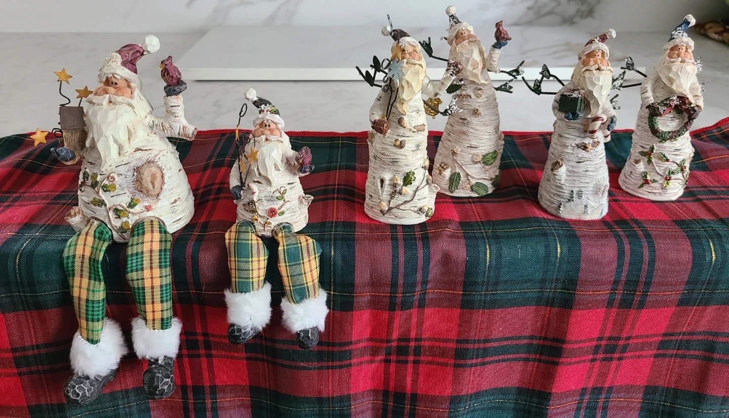 Here's a charming set of five Santa figures crafted from birch bark! These festive decorations would add a touch of rustic charm to any holiday display. New