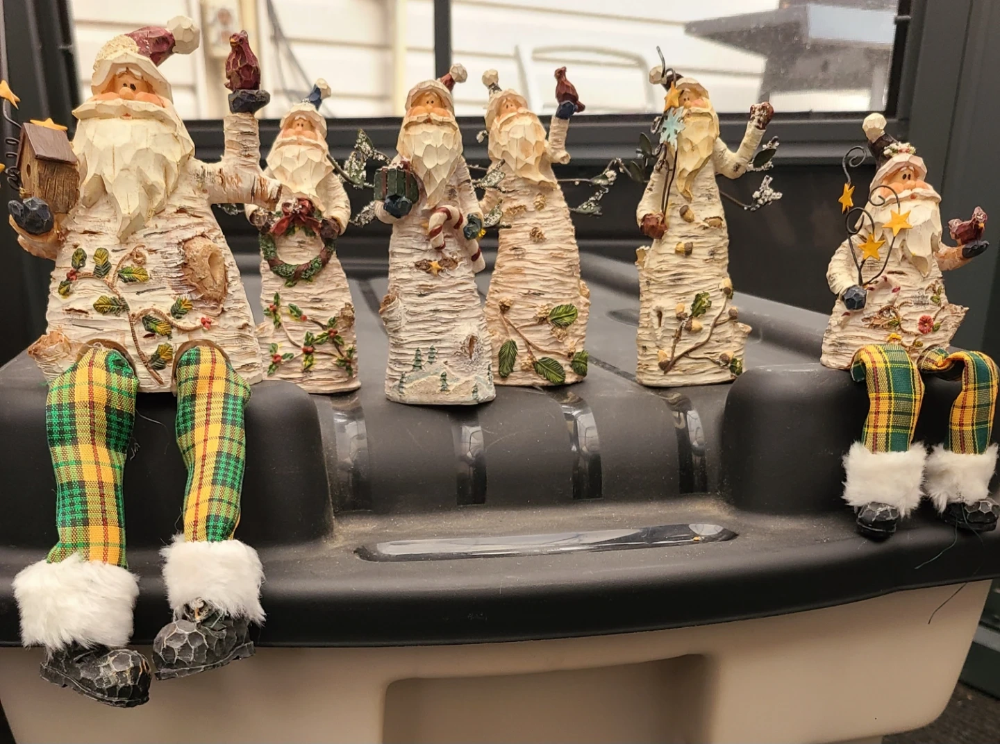 Here's a charming set of five Santa figures crafted from birch bark! These festive decorations would add a touch of rustic charm to any holiday display. New