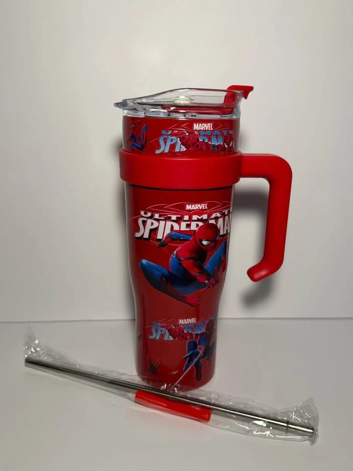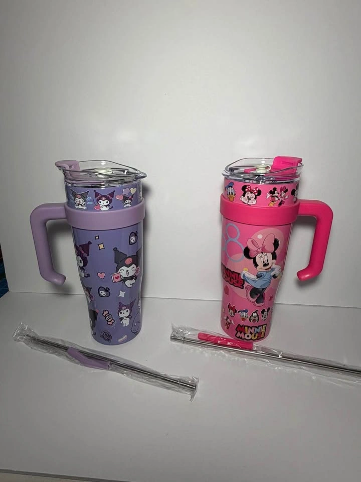 Colorful tumblers, each comes with a handle, lid, and metal straw. Available characters include Hello Kitty (pink), Stitch (blue), Kuromi (purple), Minnie Mouse (pink), and Spider-Man (red). Great for keeping drinks cool.