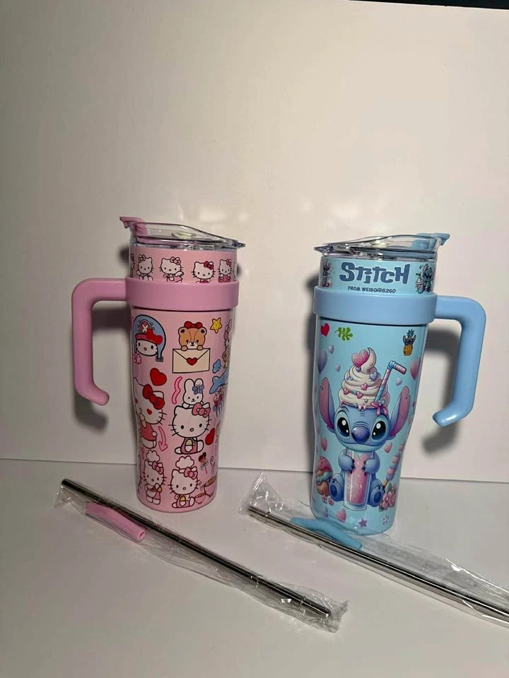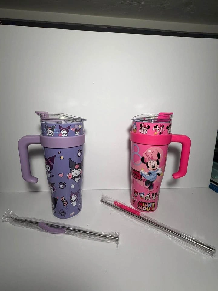 Colorful tumblers, each comes with a handle, lid, and metal straw. Available characters include Hello Kitty (pink), Stitch (blue), Kuromi (purple), Minnie Mouse (pink), and Spider-Man (red). Great for keeping drinks cool.