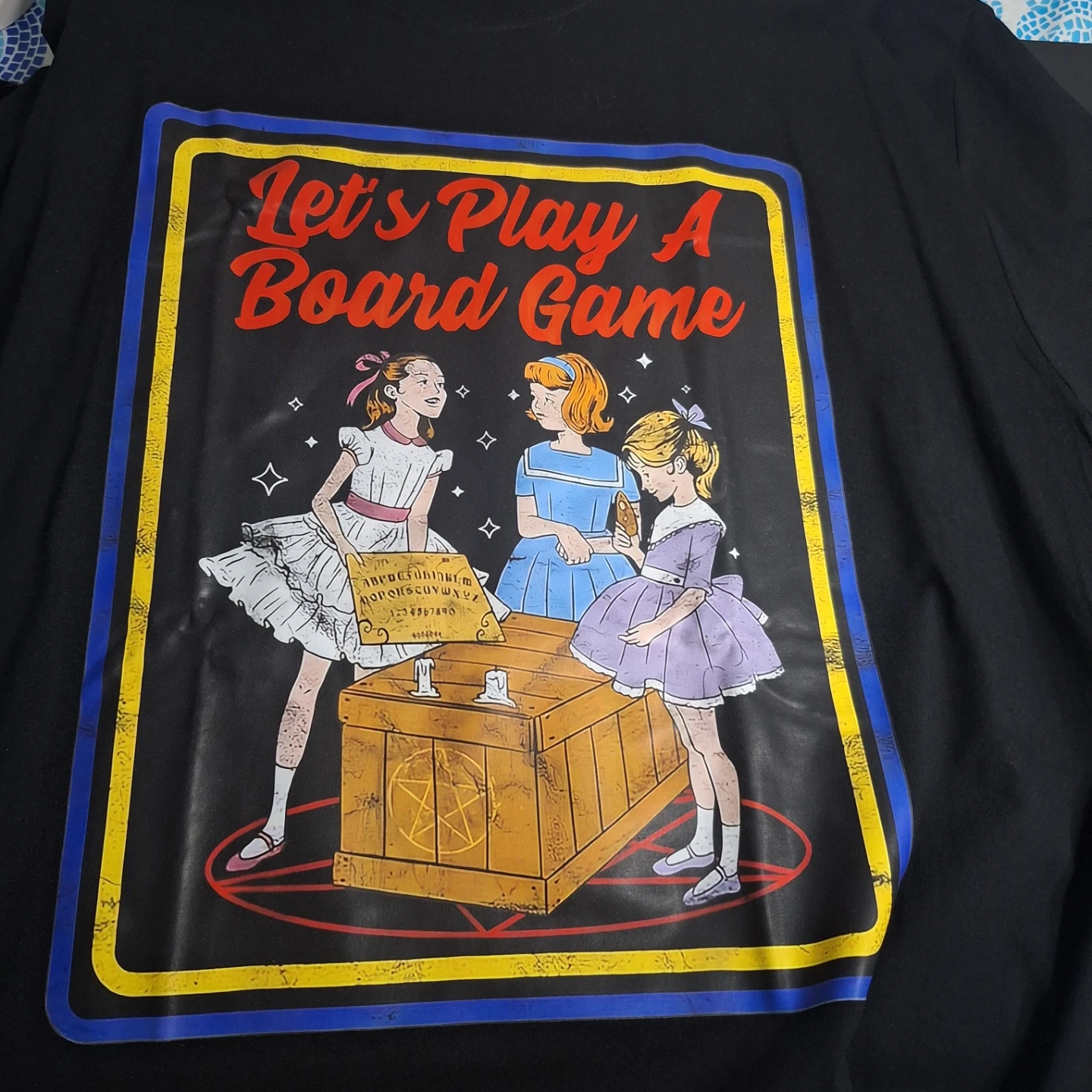 Black t-shirt in size 3XL. It's made of 100% cotton. The graphic features three girls playing a board game with a pentagram design. This shirt is great for people who like vintage or spooky aesthetics!