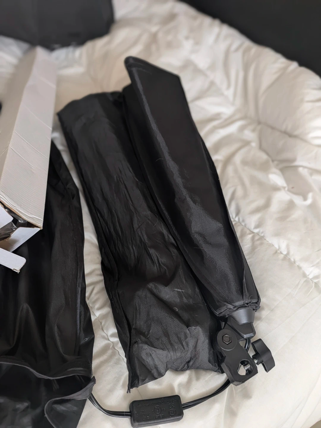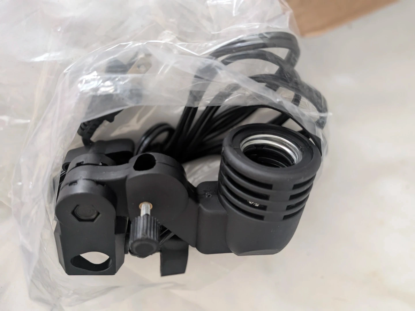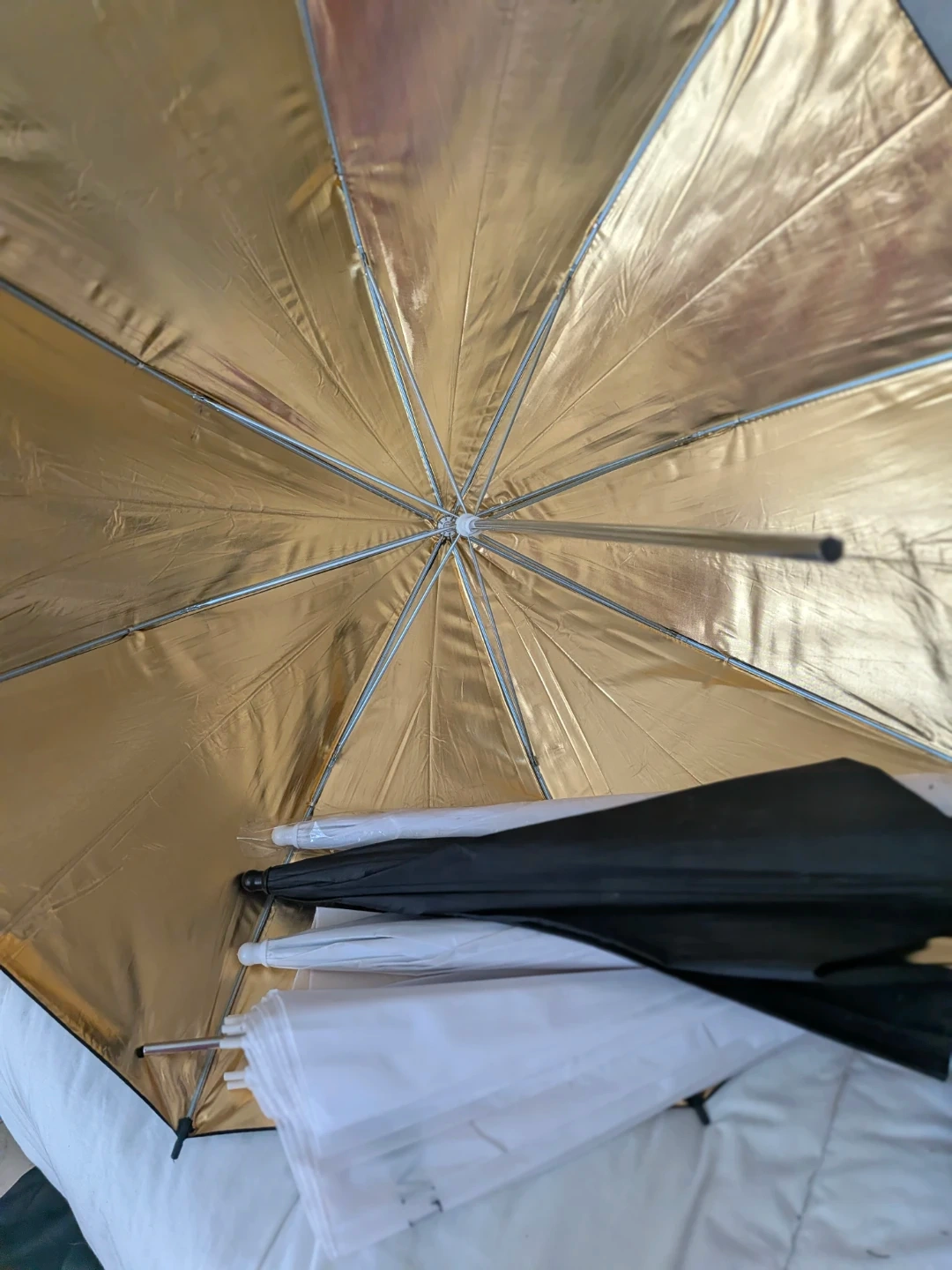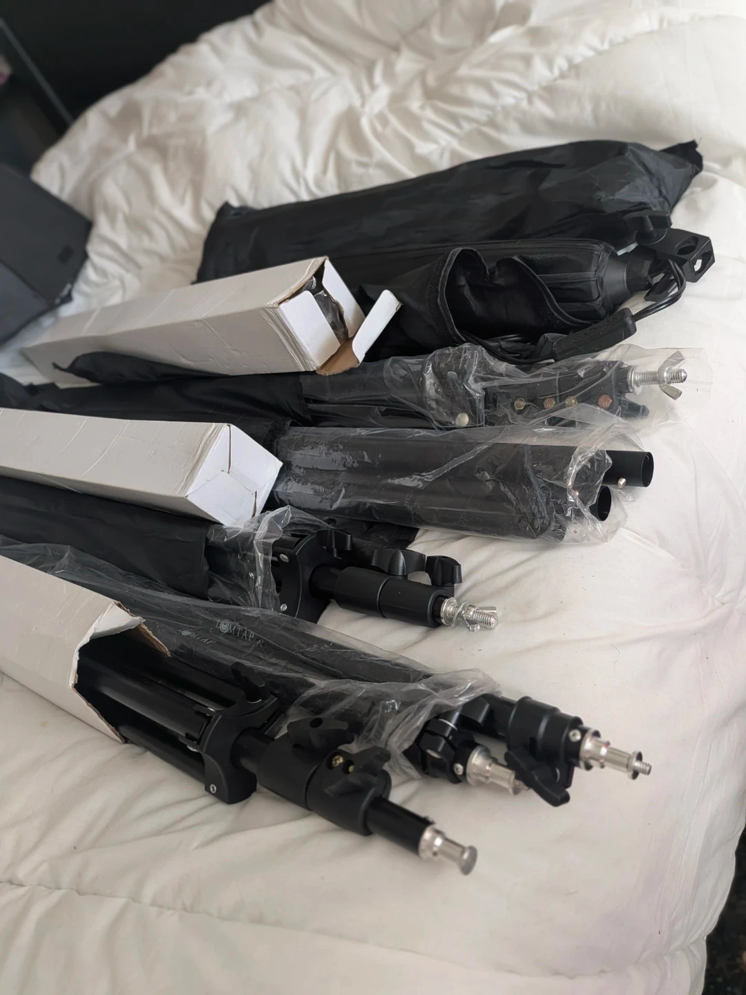 Complete photography lighting kit for your studio needs. It includes three adjustable light stands and two lighting umbrellas. The kit also comes with black, white, and green backdrops for versatile shooting options. Everything fits into a convenient carrying bag. Great for aspiring photographers! #Some LightBulbs are broken on the bottom of the bag