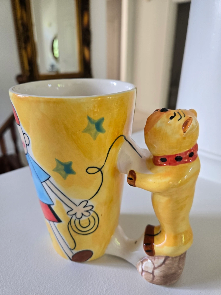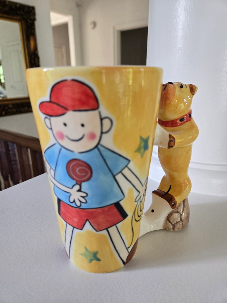 Here's a whimsical mug featuring a cute boy and a bear design! It's perfect for adding a bit of fun to your morning coffee or tea. The mug is in great shape and ready for a new home