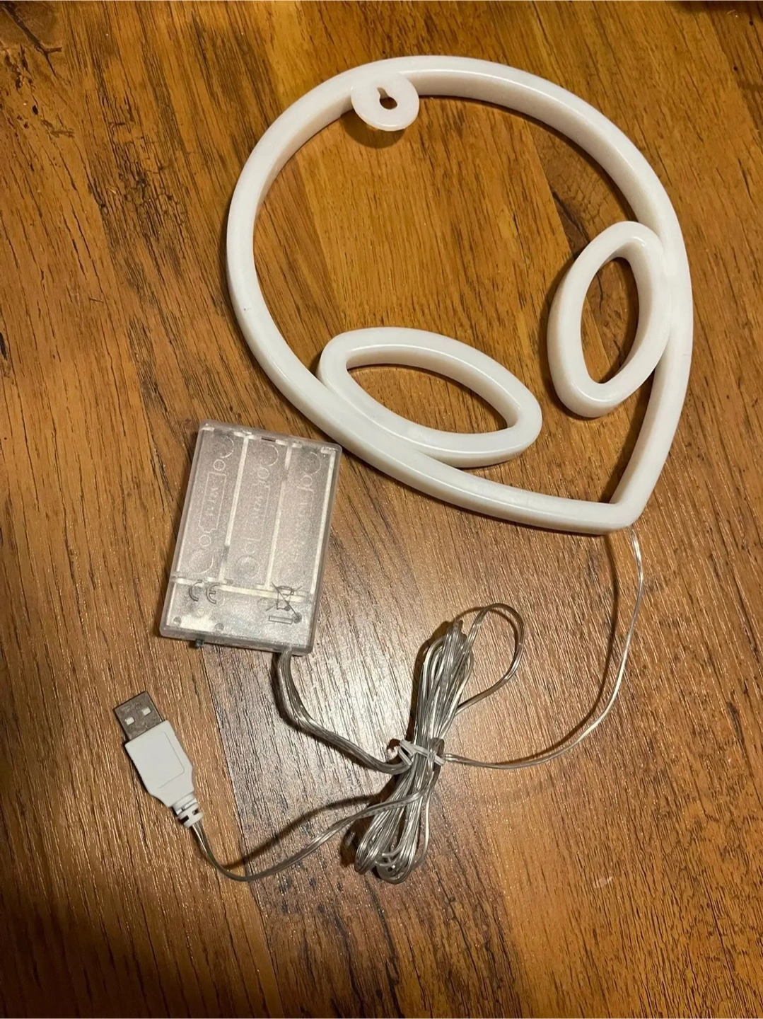 This is a neon LED light shaped like an alien face. It includes a battery pack and a USB cable for power. It's great for adding a fun accent to a room!