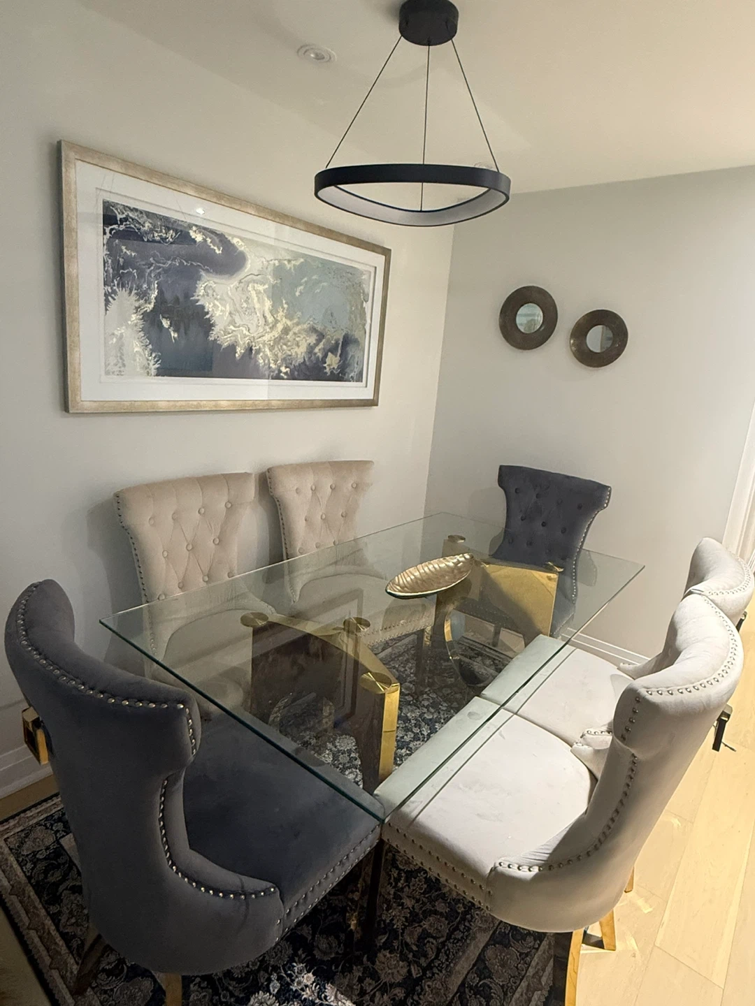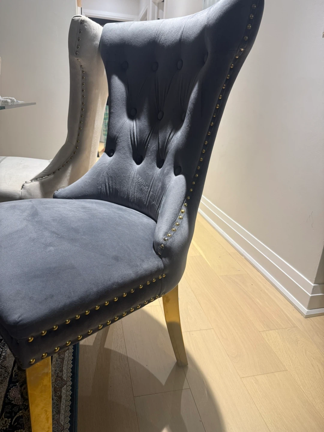 Tufted velvet dining chair in a neutral beige colour. It's upholstered with a button-tufted back and accented with gold nailhead trim. Legs are gold-toned metal.
