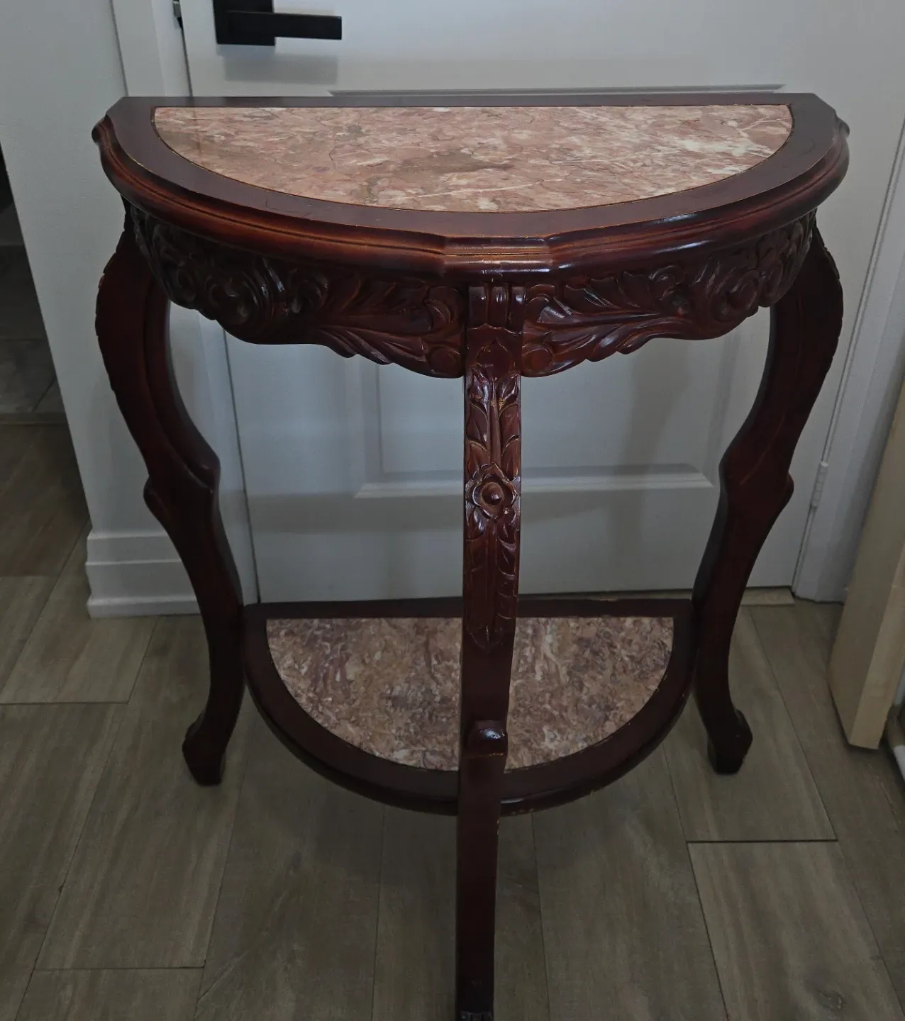 A lovely console table featuring a dark wood finish and a decorative marble inlay on both the top and the lower shelf. It has curved legs and detailed carvings on the apron. This piece is a wonderful accent for an entryway or living room.