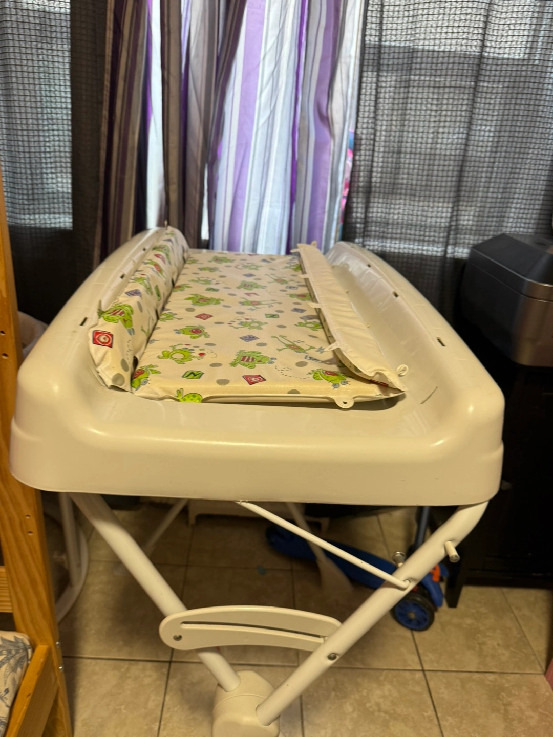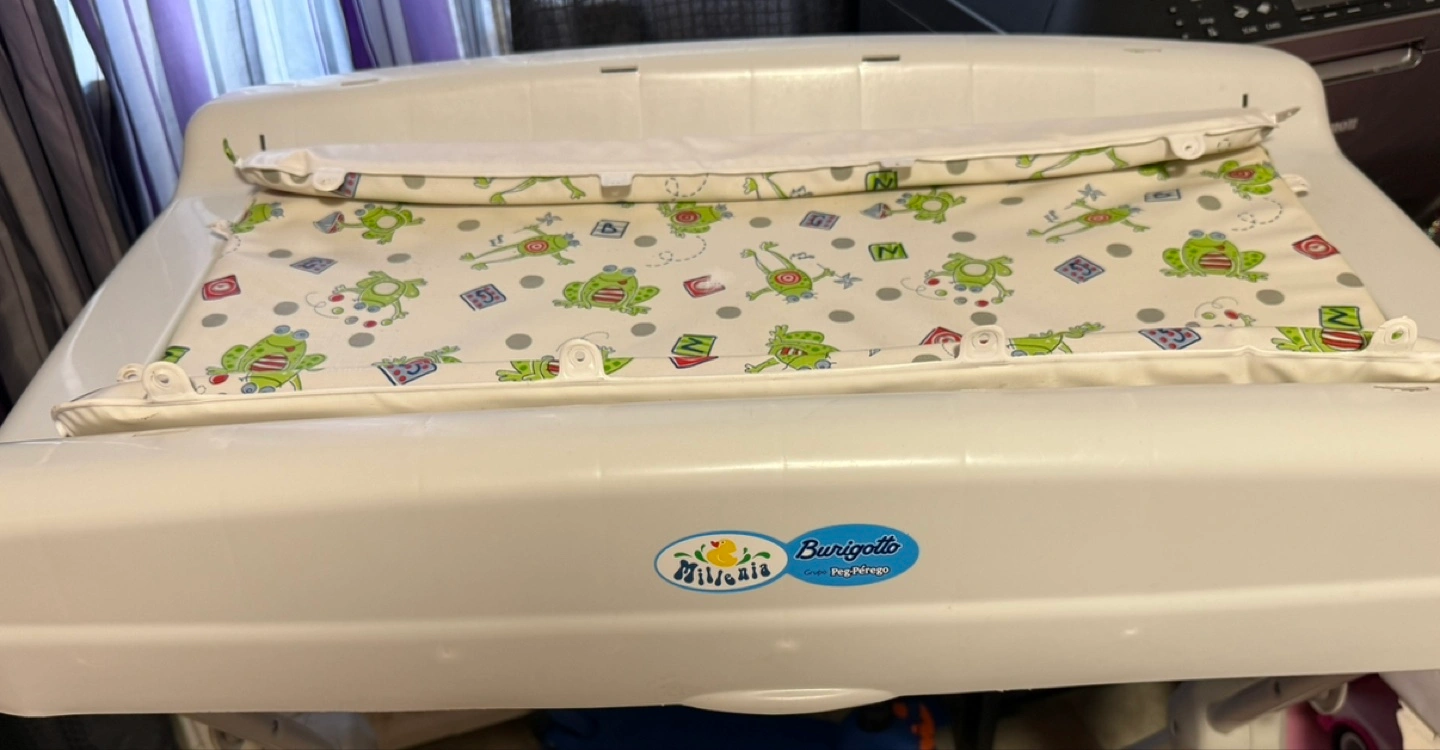 Here's a Burigotto Milenia baby changing table in great condition! It's white with a cute frog pattern on the changing pad. Perfect for keeping your little one comfy and safe during diaper changes